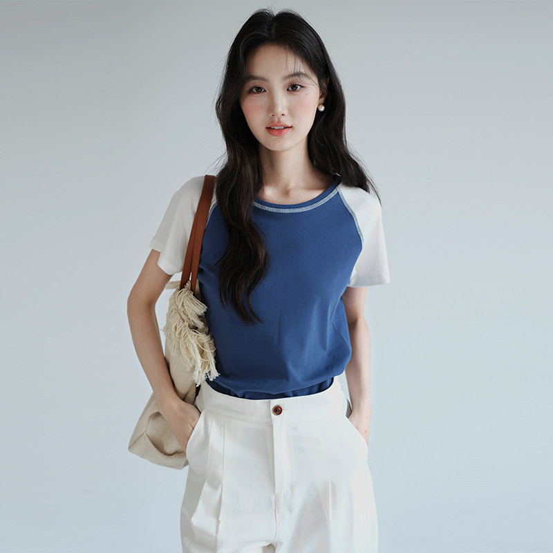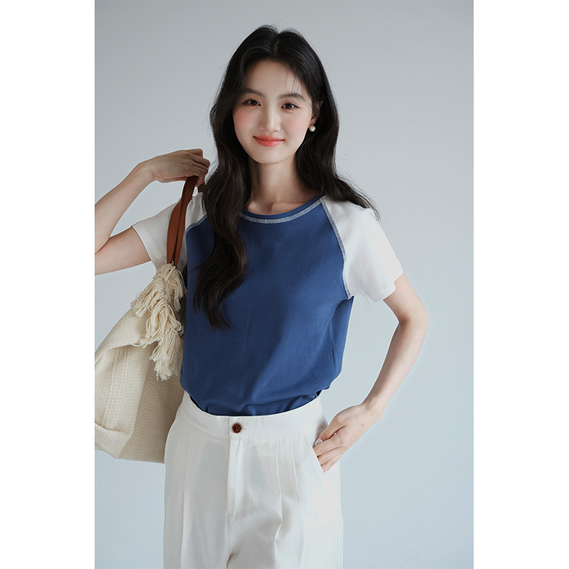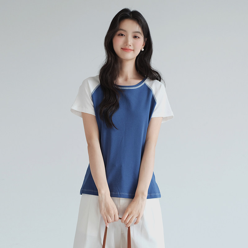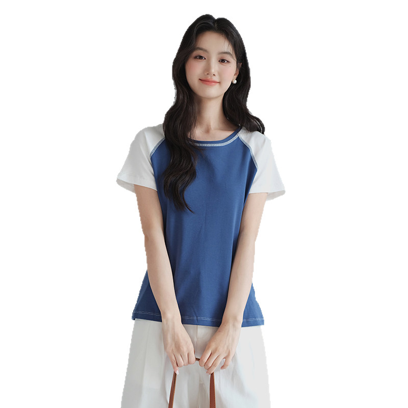 T恤胖mm夏装 亲肤舒适明插肩袖 简约撞色正肩上衣 女装 蓝若水大码