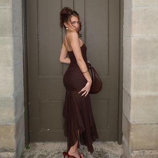 度假风咖色网纱抹胸连衣裙2025夏季 辣妹收腰显瘦包臀中长裙女 新款