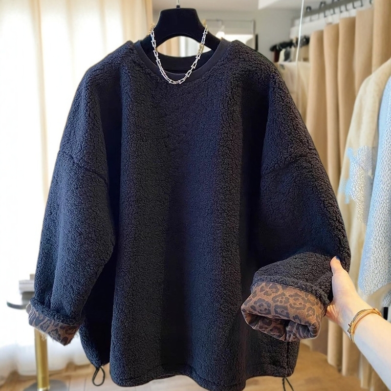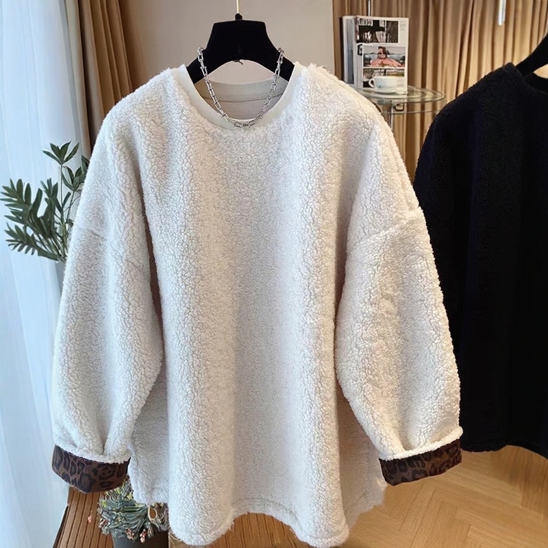 上衣 胖mm宽松套头慵懒风中长款 圆领羊羔毛卫衣女冬季 加绒加厚大码