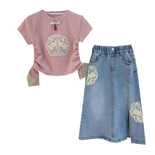 儿童女套裙中国风洋气短袖 2025新款 半身牛仔裙两件套 套装 女童夏装
