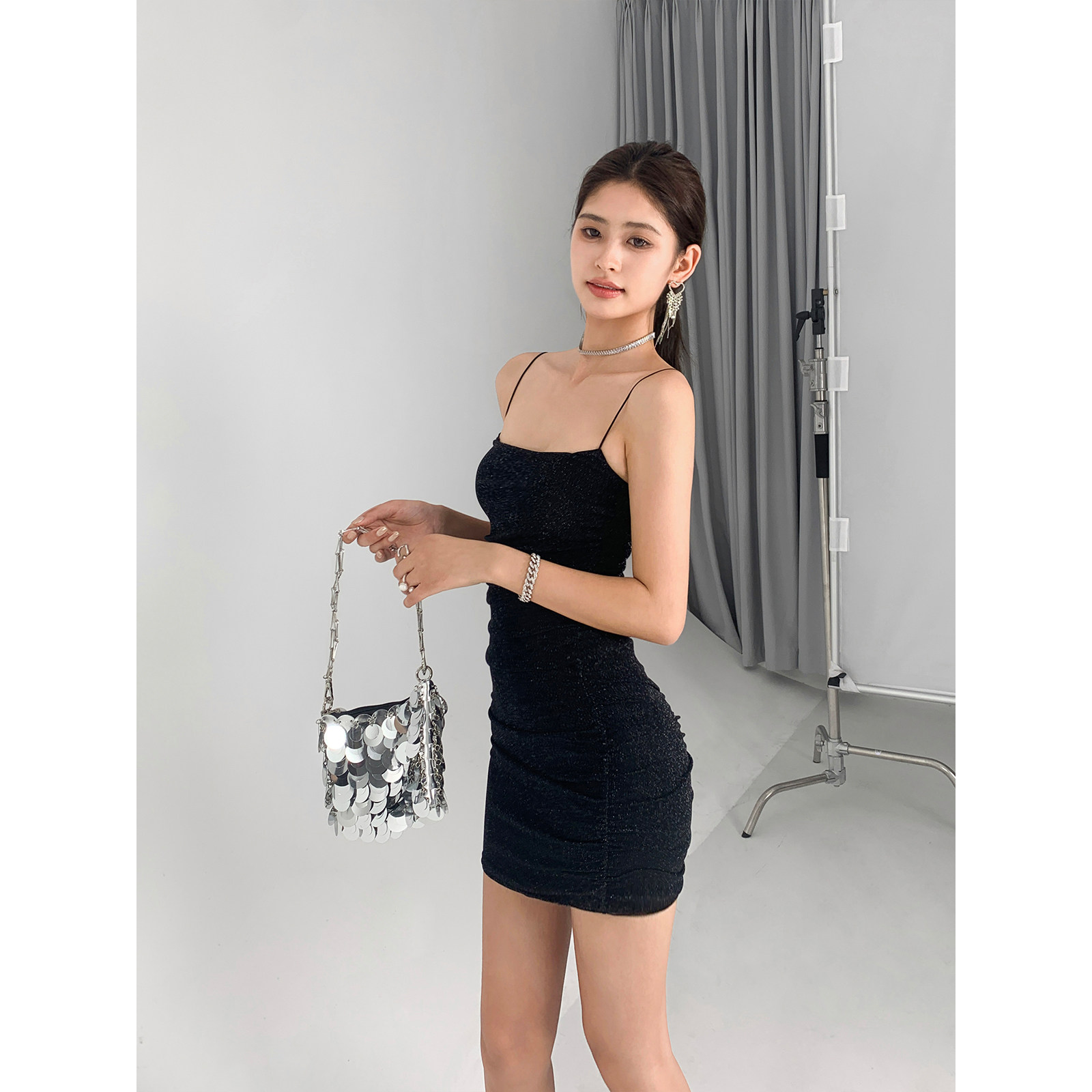 褶皱包臀短裙 银丝细闪吊带连衣裙女夏设计感辣妹修身 怪力酱 美式