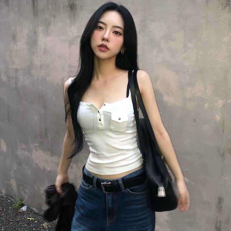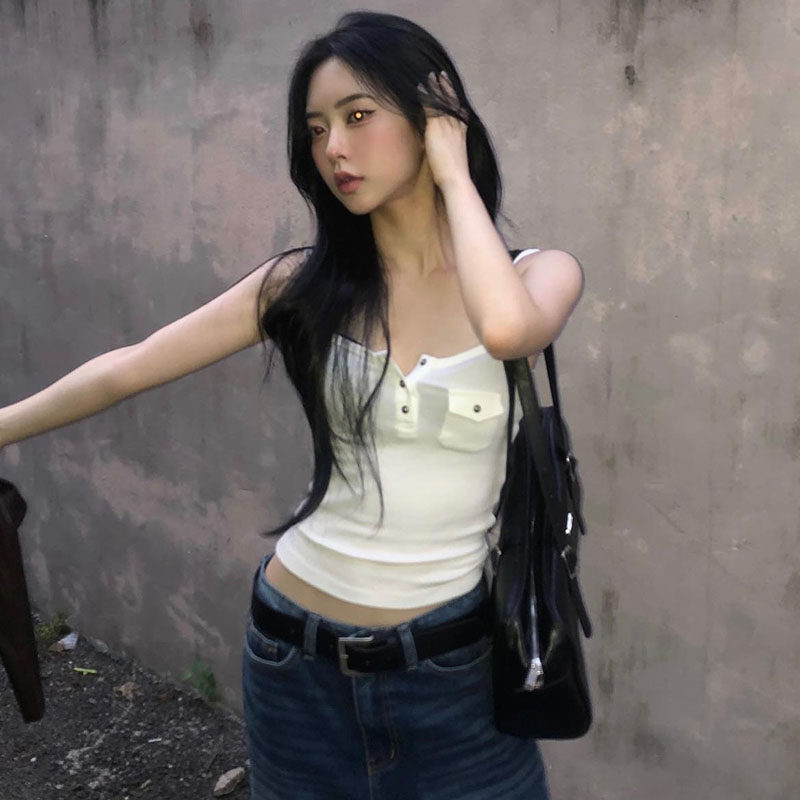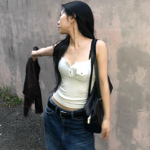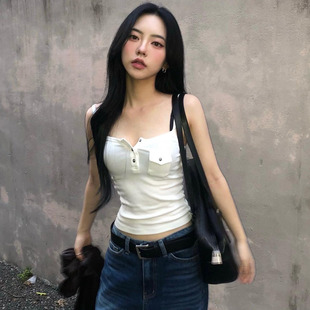 DARLINGAGA基础百搭口袋外穿吊带背心女简约休闲修身 显瘦针织上衣