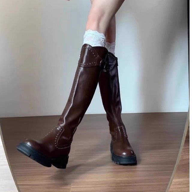 马思纯同款 金属搭扣长筒堆堆靴圆头中筒骑士靴子女 unfolio2025款