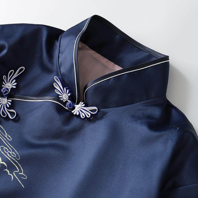 高档真丝殡葬用品天玺 斜襟旗袍寿服 寿衣女全套 老人现代蓝色中式