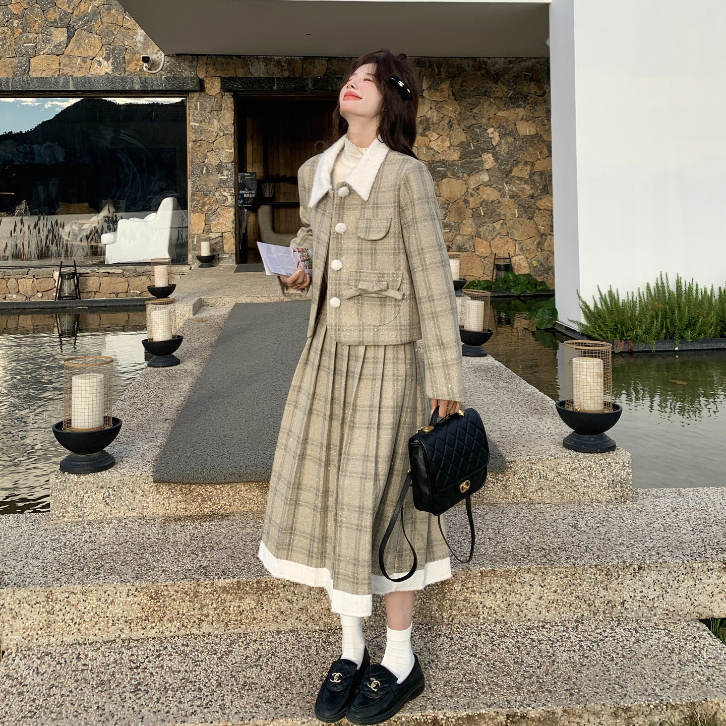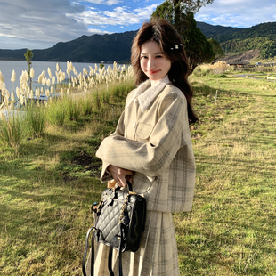 打底上衣三件套装 甜美轻奢温柔风高领针织马甲毛衣女 格纹半身裙