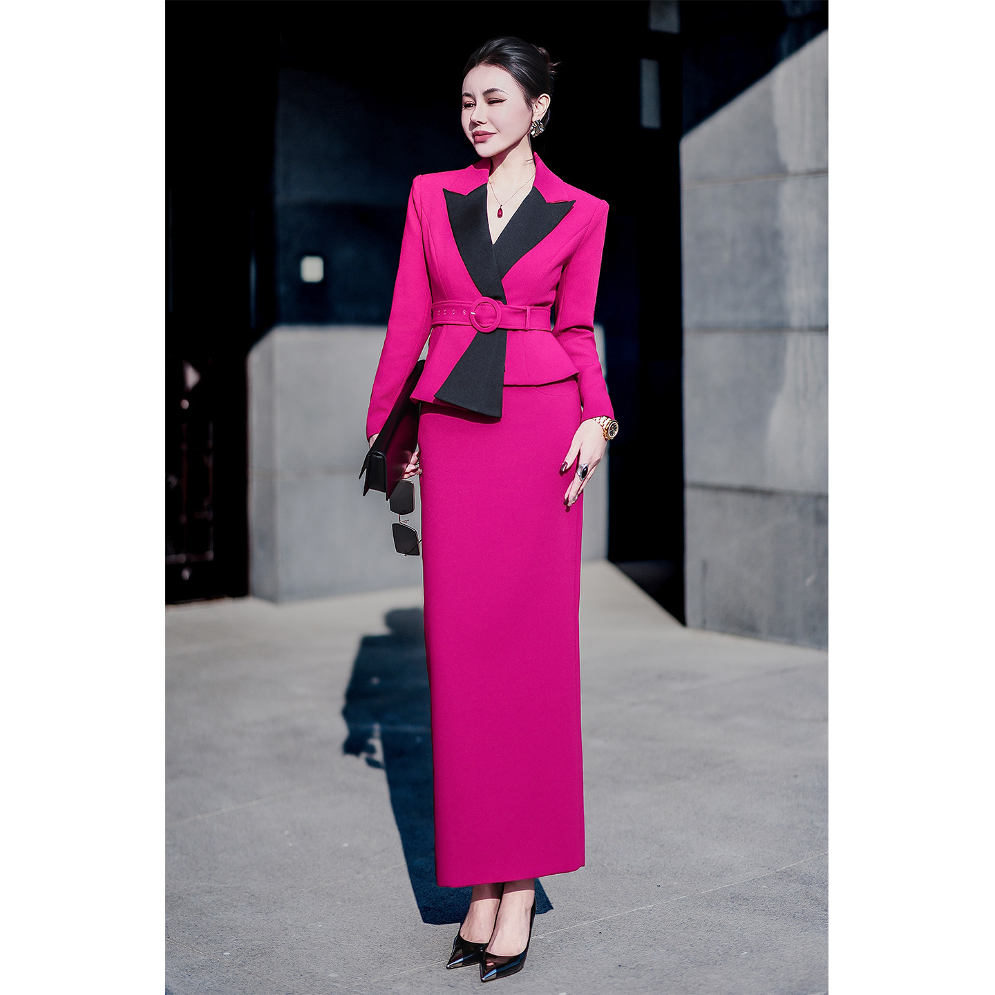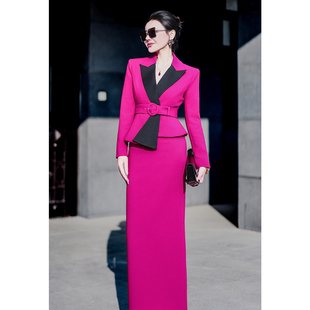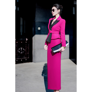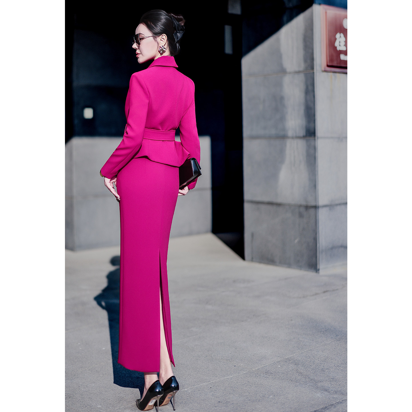 玫红色长袖 女商务正装 修身 外套半身裙套装 职业套裙两件套 西装 时尚