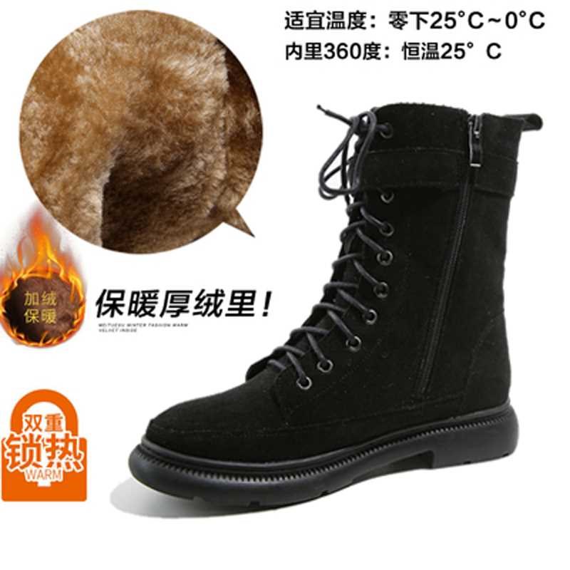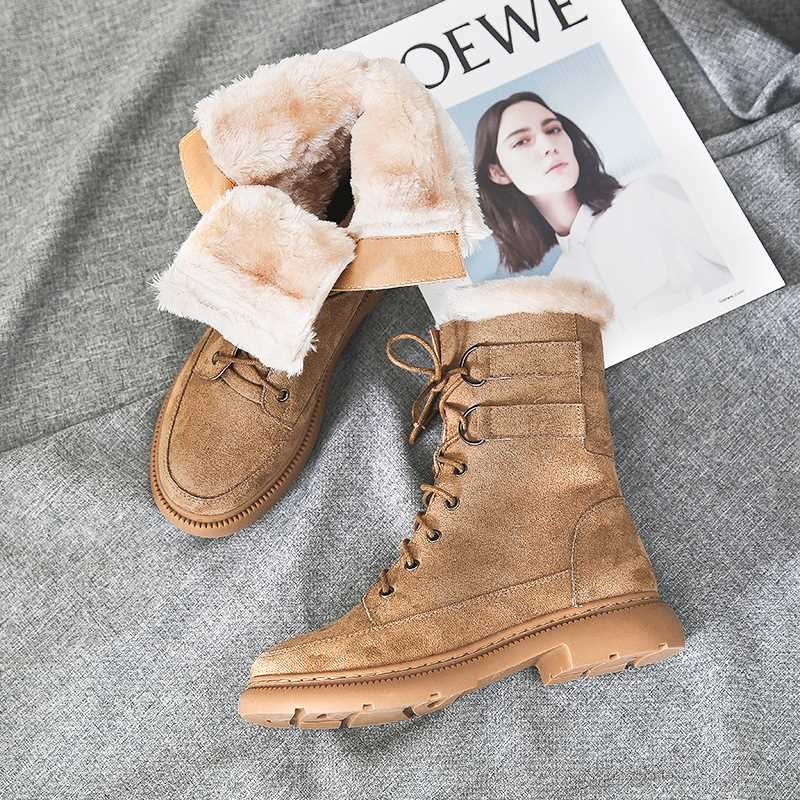 新款 英伦风系带厚底马丁靴女冬加绒加厚 中筒雪地靴女保暖棉鞋
