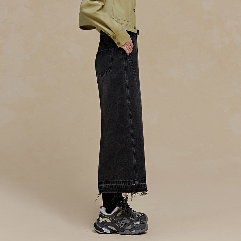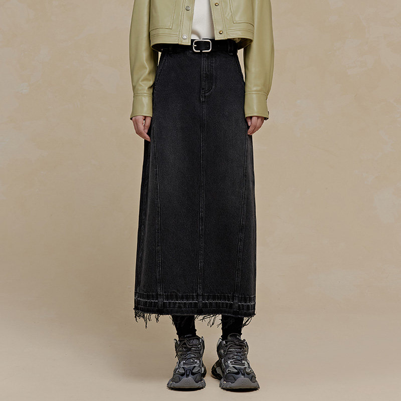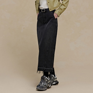 高腰显瘦 新款 PIT经典 黑色做旧牛仔长裙100%棉流苏半身裙2025秋季