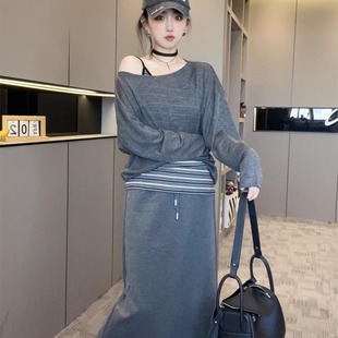 条纹吊带 欧洲站减龄套装 T恤 长袖 半身裙长裙 三件套女2025秋新款