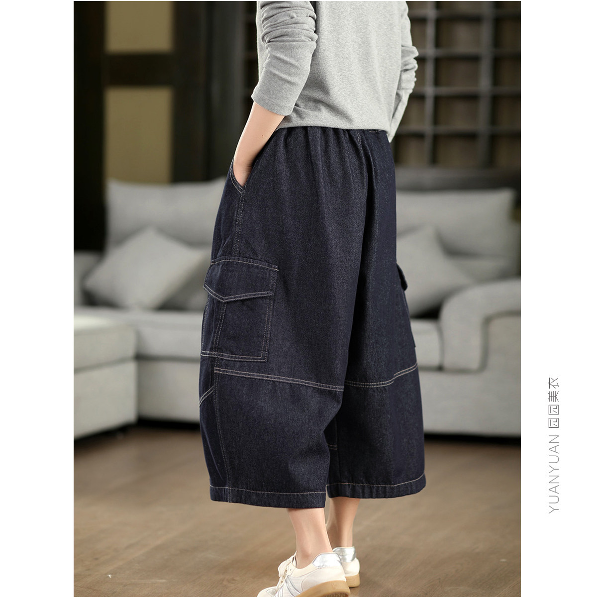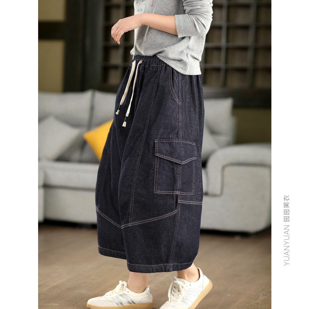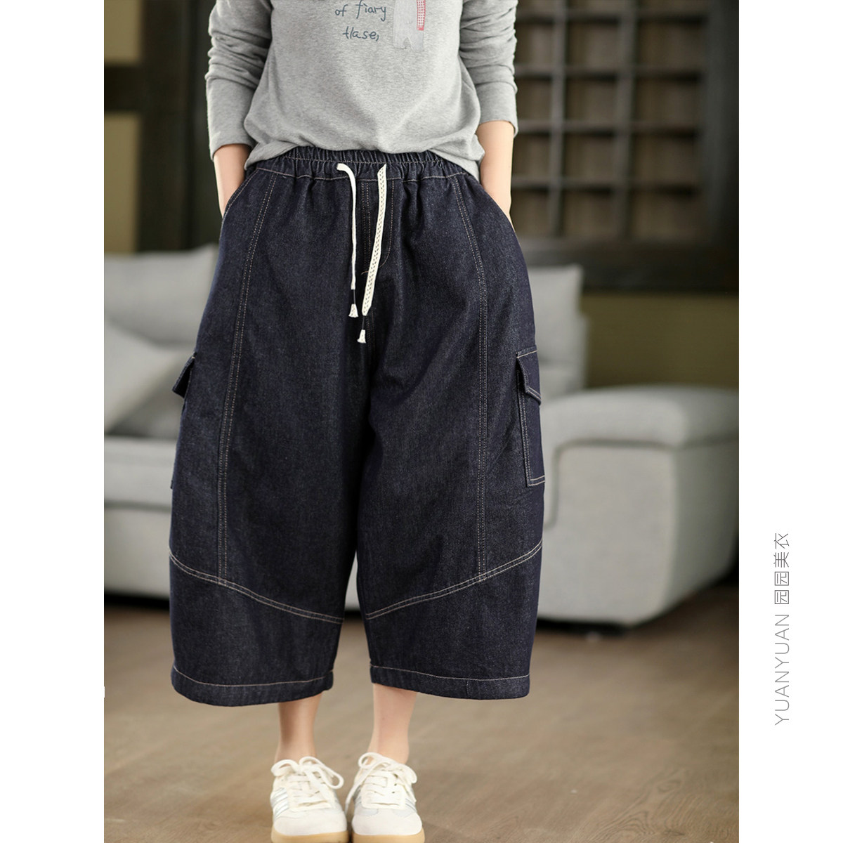 园园美衣复古立体拼接显瘦牛仔裤 女春夏系带松紧腰直筒休闲七分裤
