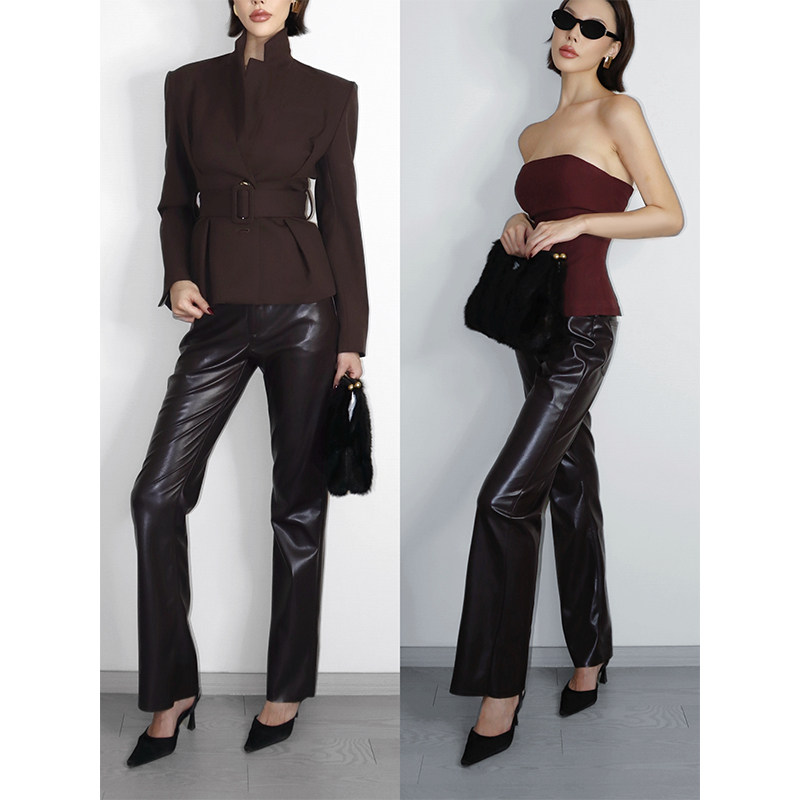 百搭长裤 修身 女秋冬垂感显瘦直筒裤 VanessaLab秋冬保暖咖色pu皮裤