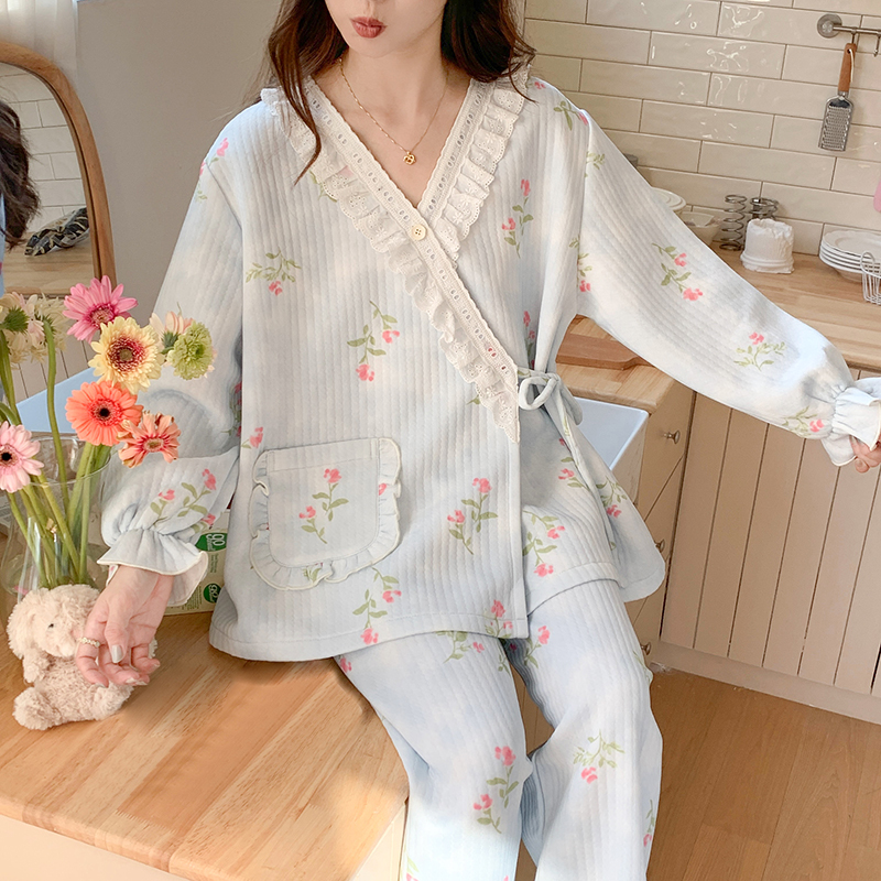 加大码 套装 家居服春秋 秋冬季 芬腾女士睡衣空气棉夹层纯棉加厚长袖