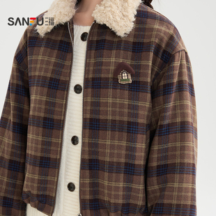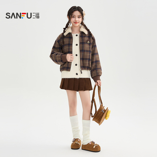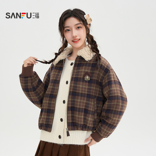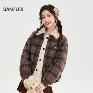 饰毛绒翻领格子短上衣女装 可拆装 848989 冬季 三福加厚外套2025新款