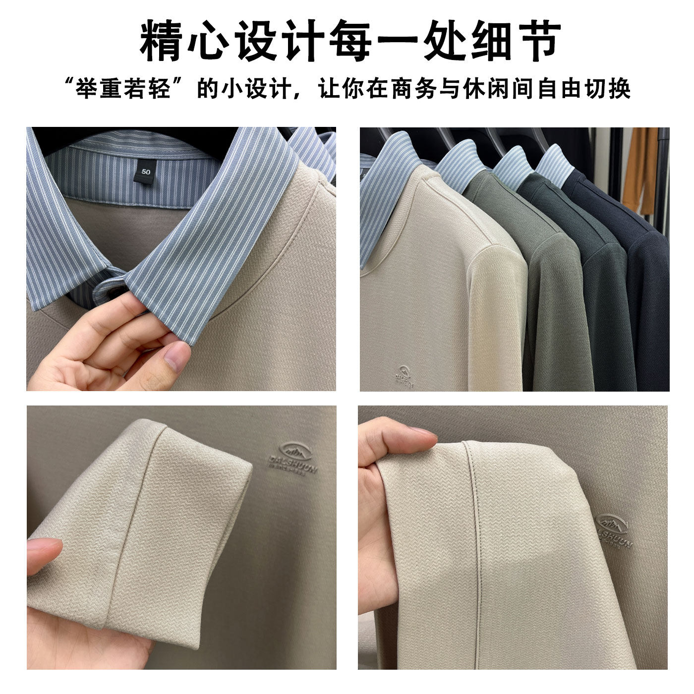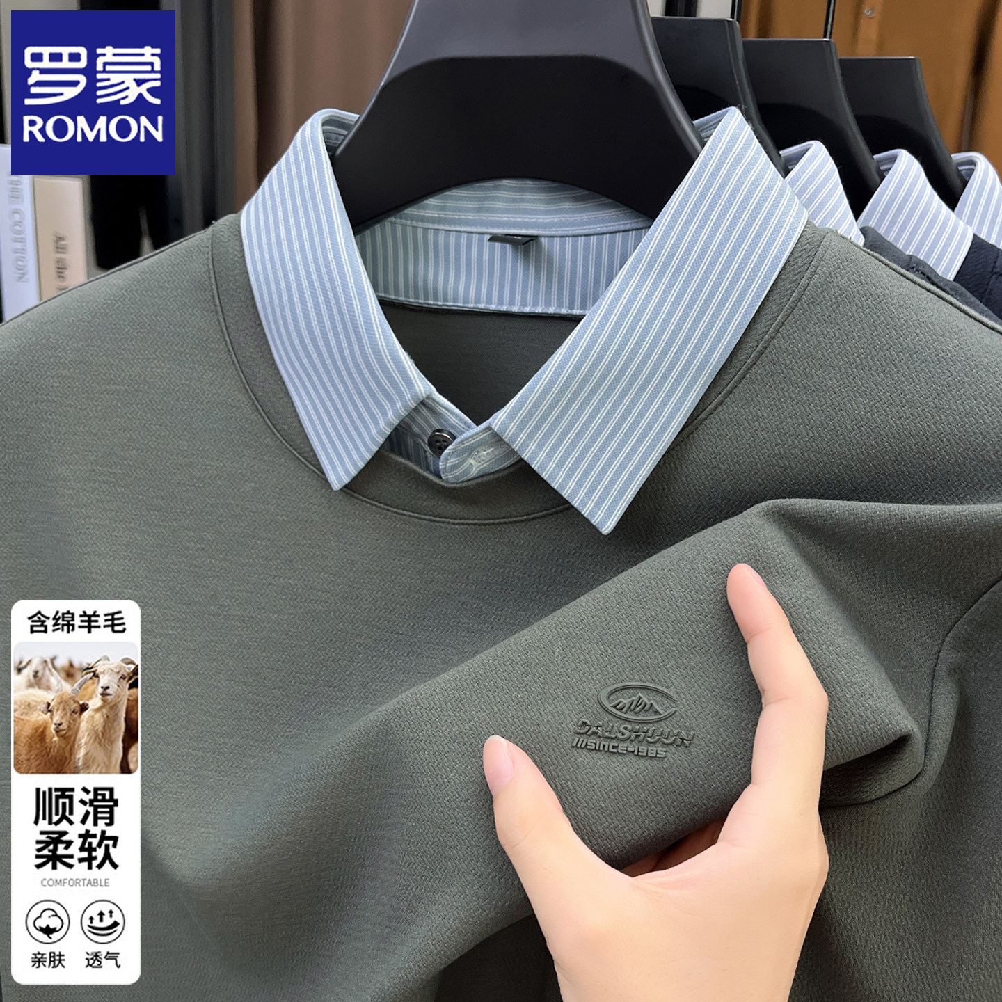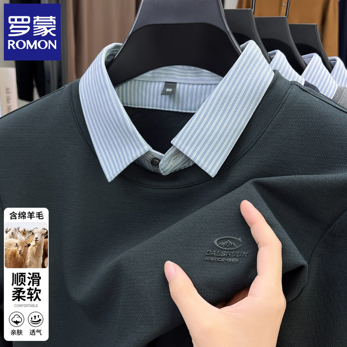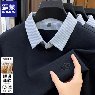 新款 罗蒙含羊毛假两件衬衫 2026春秋季 T恤男士 中年打底上衣 领长袖