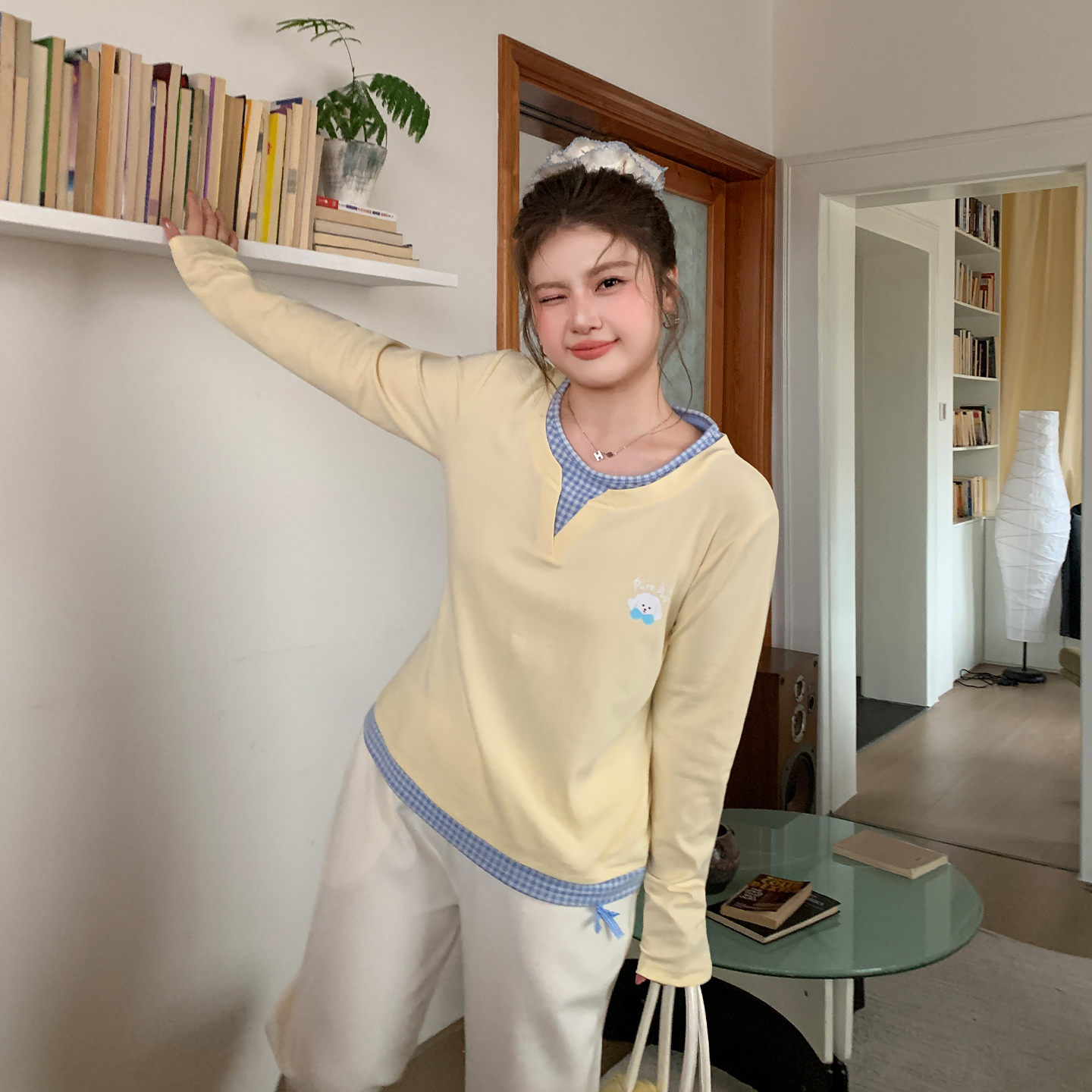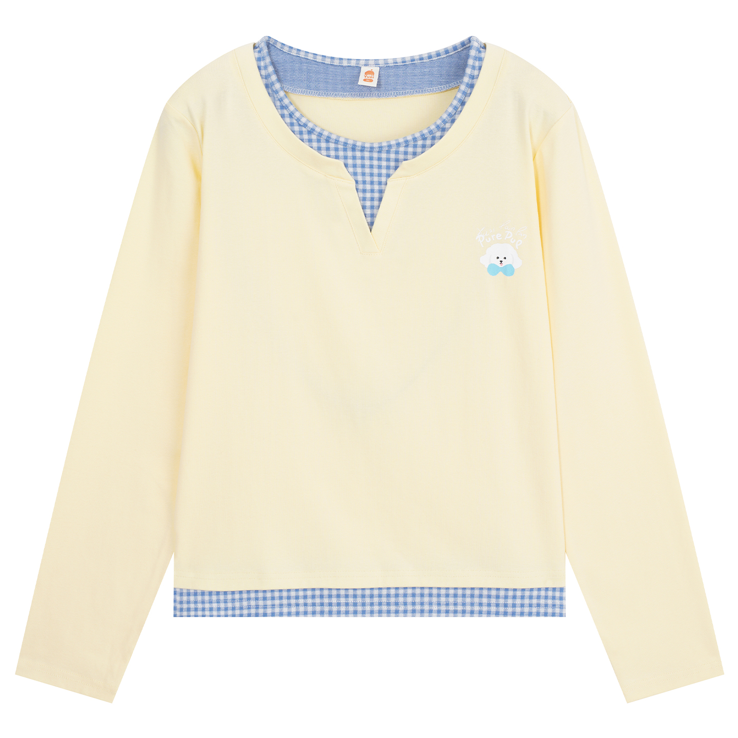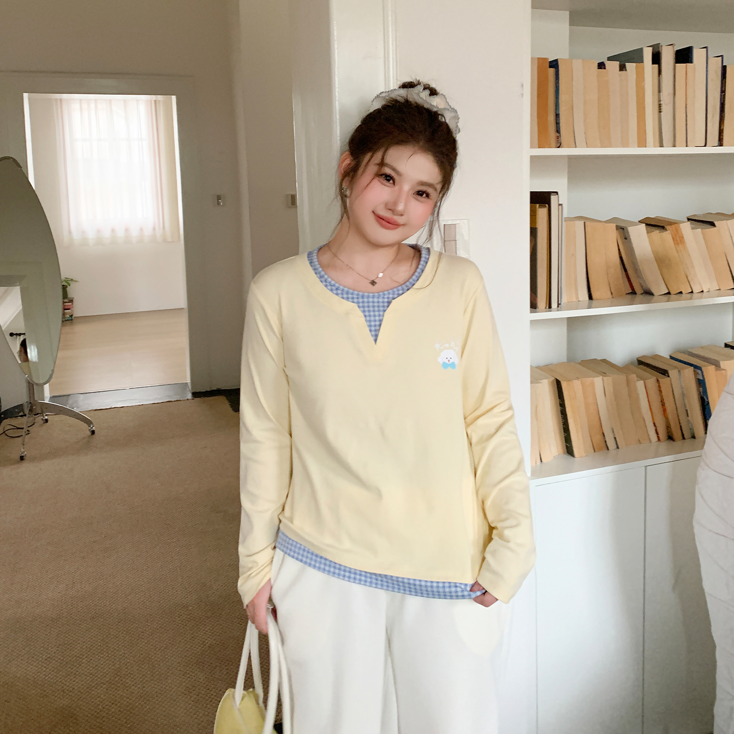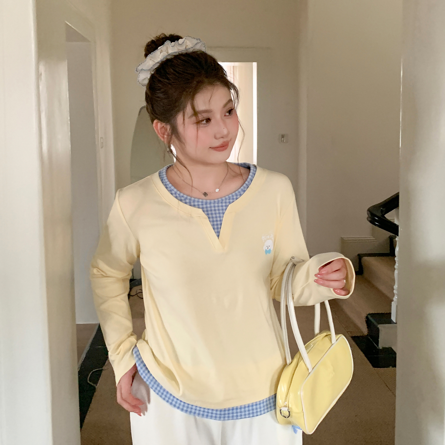 黄色拼接格纹内搭上衣秋冬胖mm 女装 YUZI鱼子假两件长袖 T恤特大码