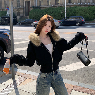 alex 黑色加绒保暖短上衣 tevens复古毛领连帽卫衣拉链外套女冬季