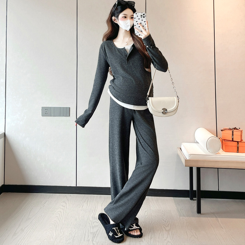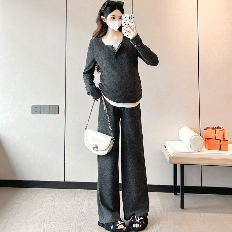圆领遮肚上衣阔腿裤 孕期穿搭长袖 两件套 春秋2025新款 孕妇灰色套装