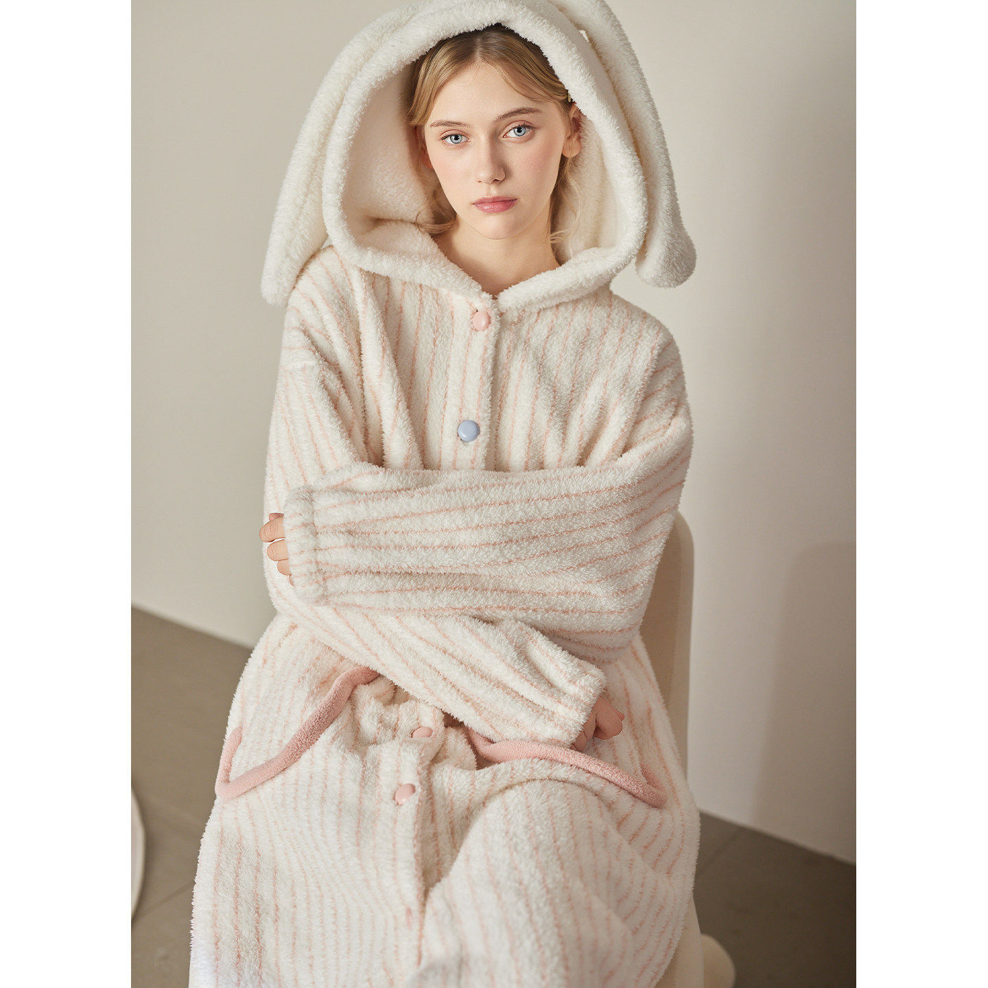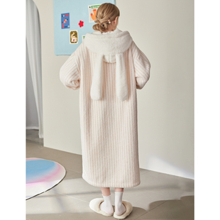芬腾女士睡袍秋冬季 加绒加厚可爱抗静电家居服 珊瑚绒连帽睡衣女款