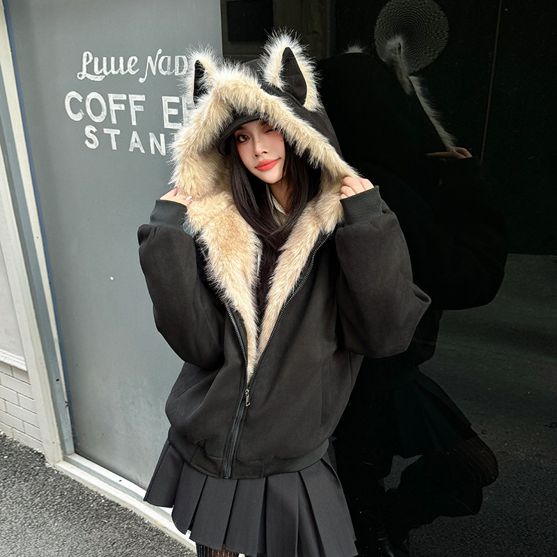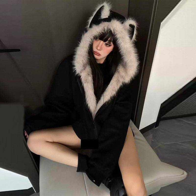 慵懒风派克服棉服 藏青色复古加厚夹棉连帽外套女胖mm美式 大码 女装