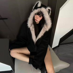 棉服女美式 胖mm黑色工装 复古派克服加厚大毛领外套 女装 300斤大码