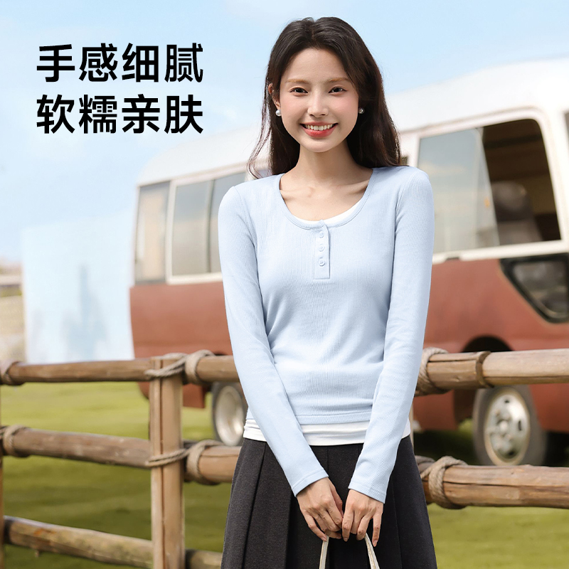 T恤辣妹修身 班尼路黑色U领假两件打底衫 长袖 新款 内搭Q 女2025秋季