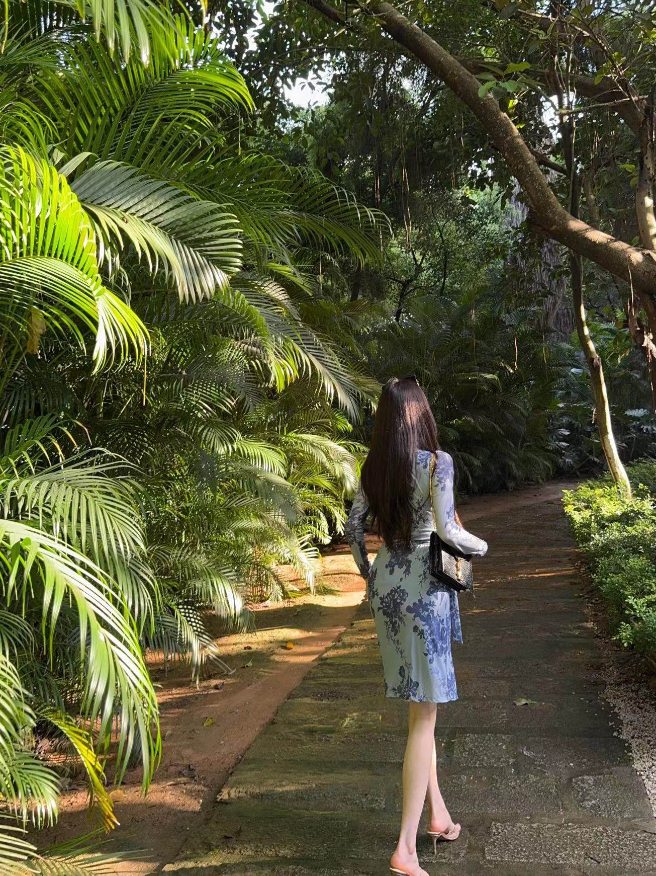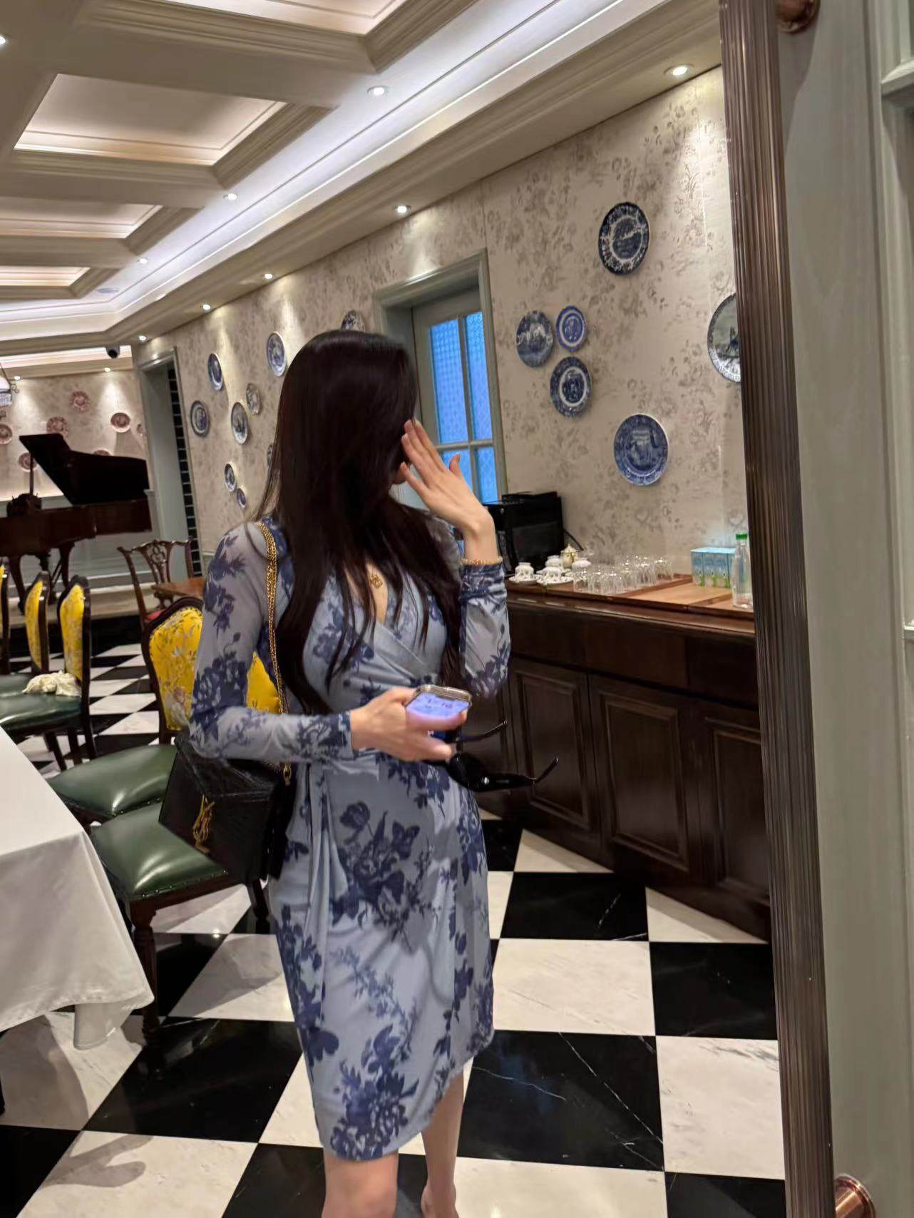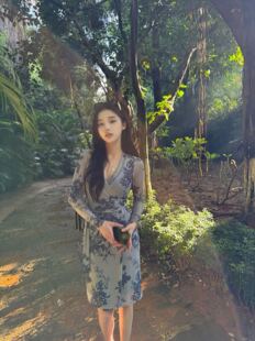 复古印花长袖 green大姐姐 修身 韩版 v领收腰连衣裙中裙 春日来信