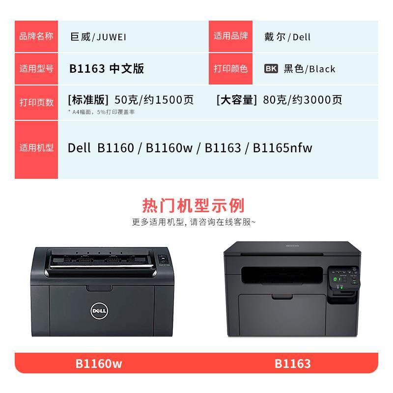 b1165nfw打印机墨盒B1160w B1163 适用戴尔B1160硒鼓dell 巨威
