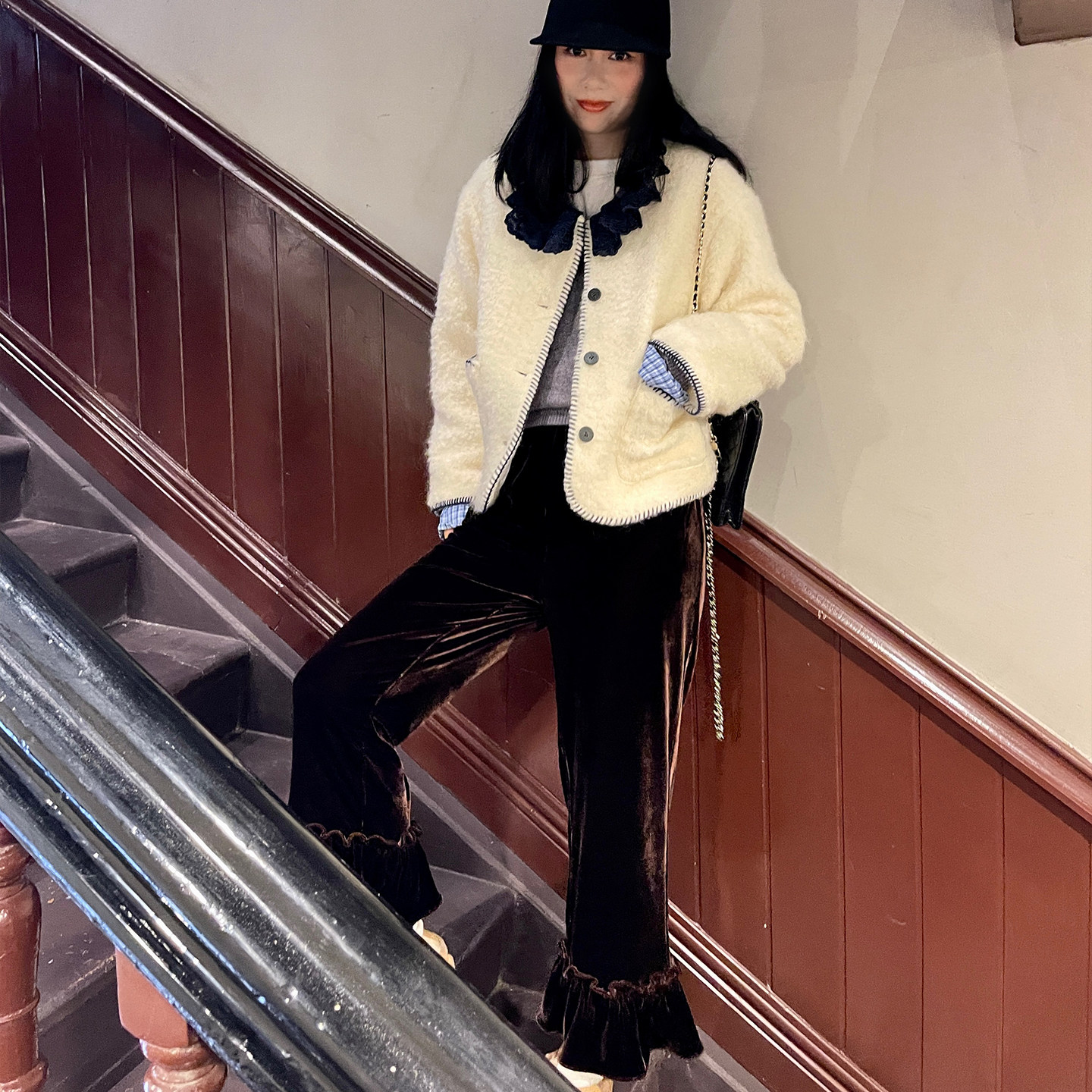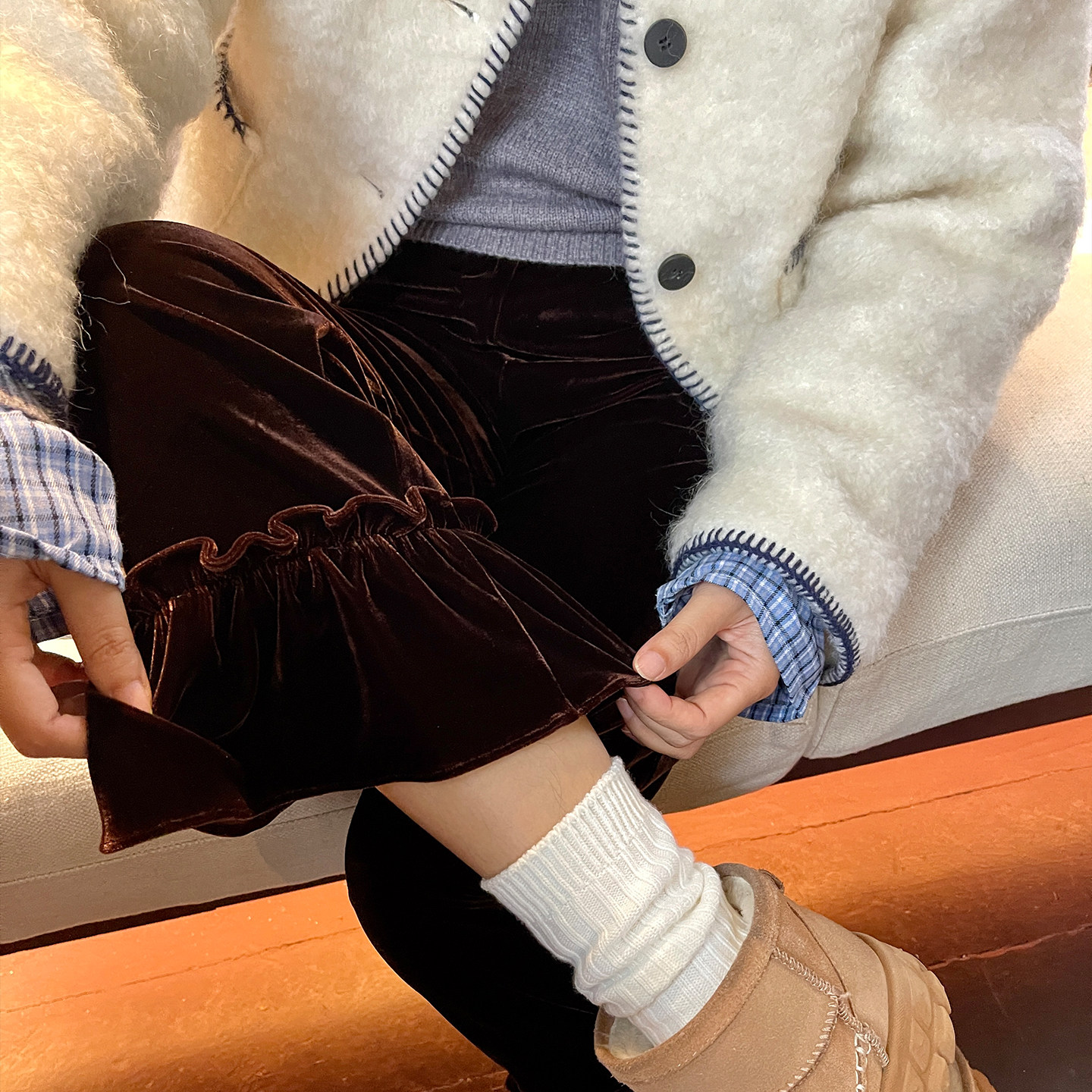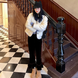 松紧腰打底保暖裤 heidy海蒂 9分裤 宽松冬季 子 深咖色荷叶边丝绒裤
