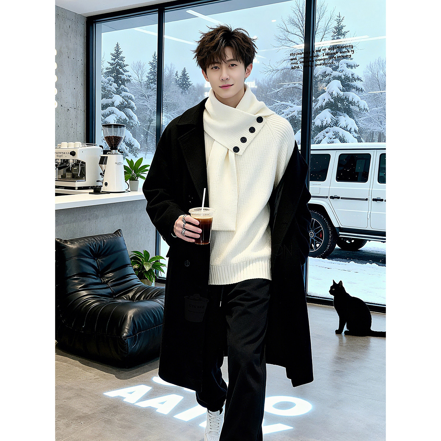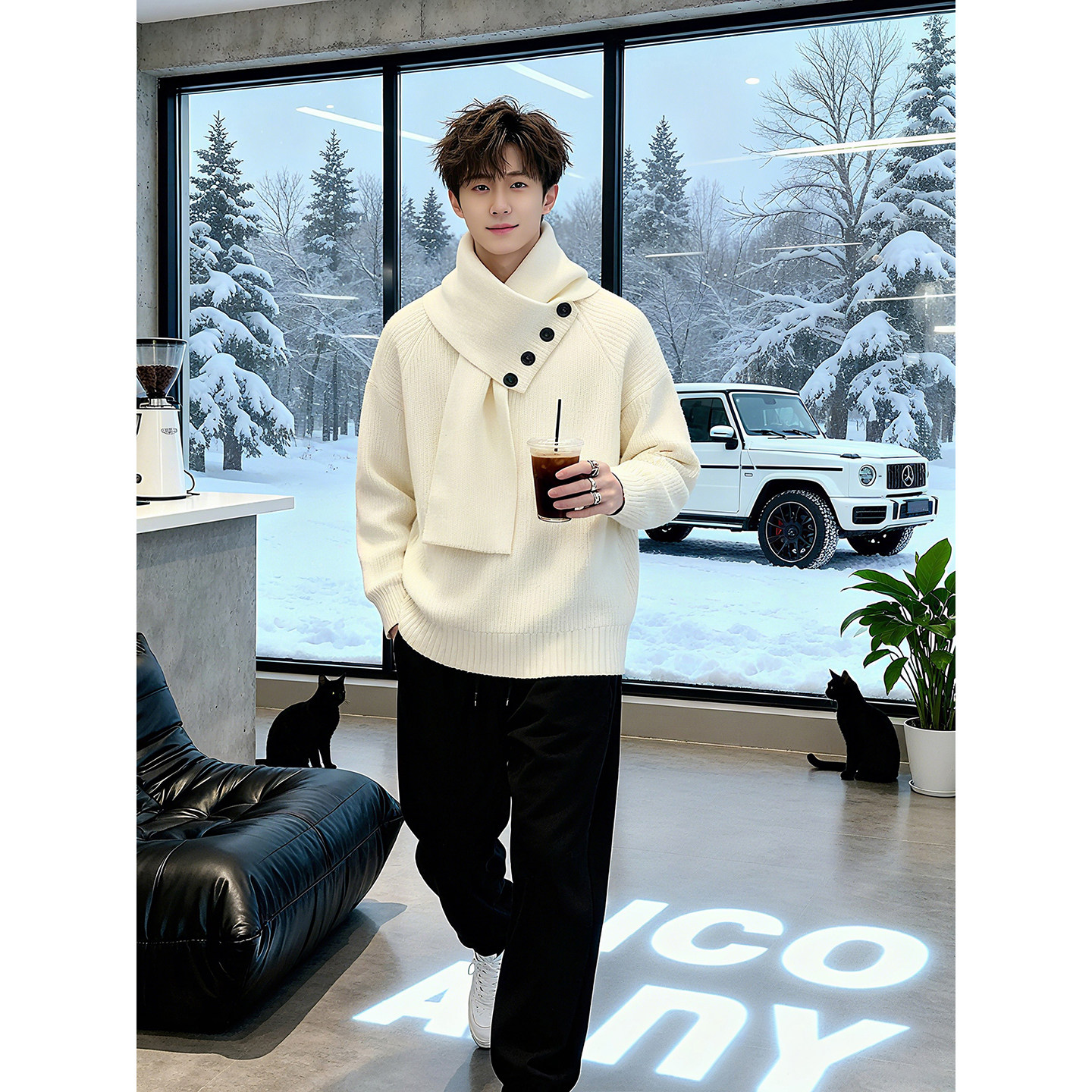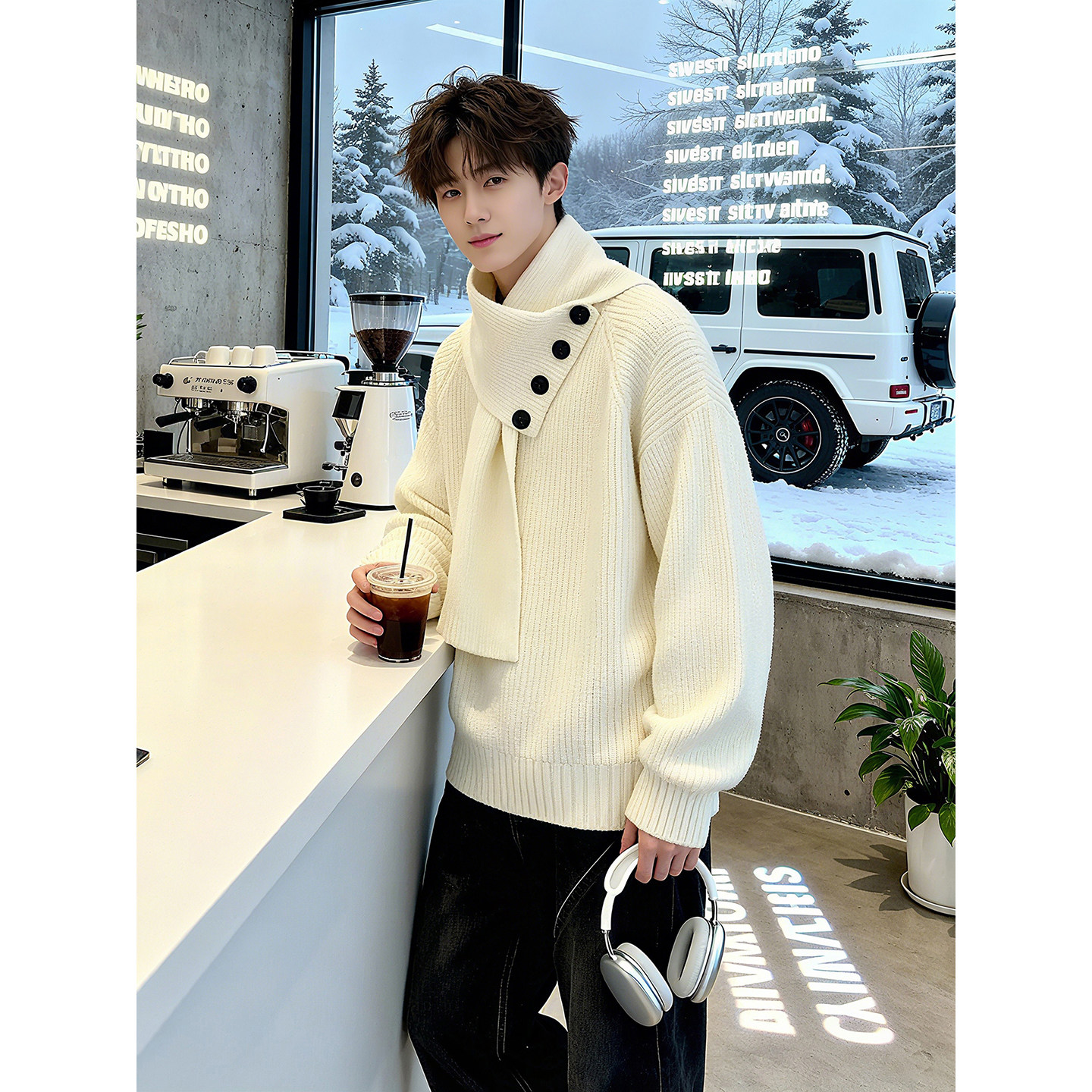 慵懒高级感外套带围脖围巾一体针织衫 新中式 半高领加厚毛衣男冬季