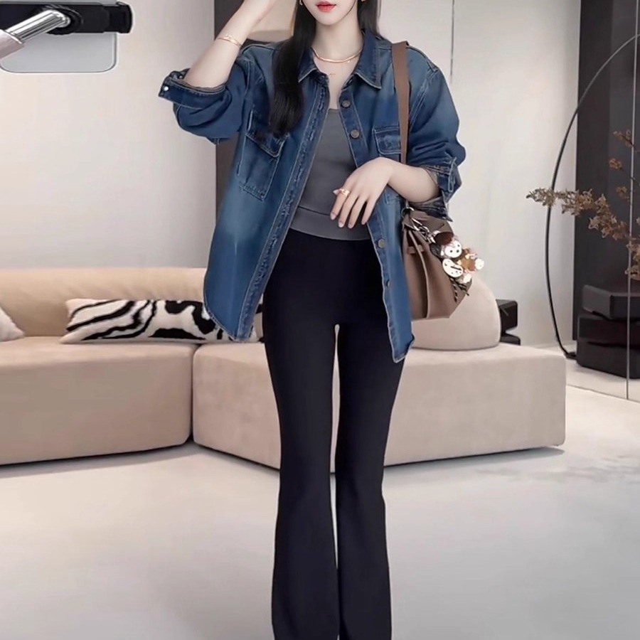 宽松休闲纯色长袖 秋季 上衣外套 男生2025新款 蓝色翻领水洗牛仔衬衫