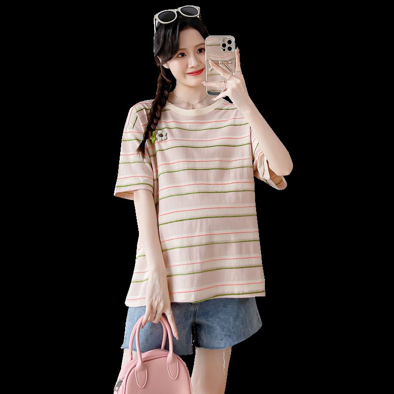 夏装 中长款 上衣2025新款 网红条纹花朵短袖 纯棉孕妇T恤 韩版 孕妇装