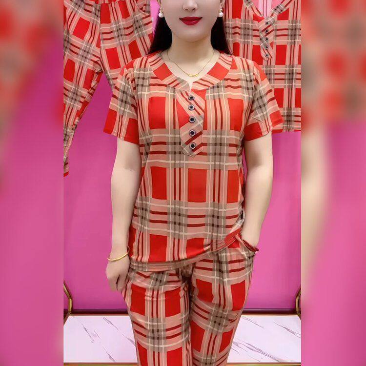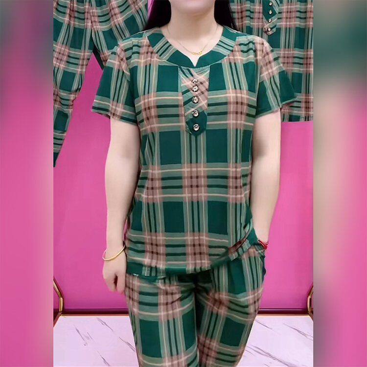 下单立减50 套装 H夏季 剪刀领大格子百搭女士宽松短袖 MM052 新款