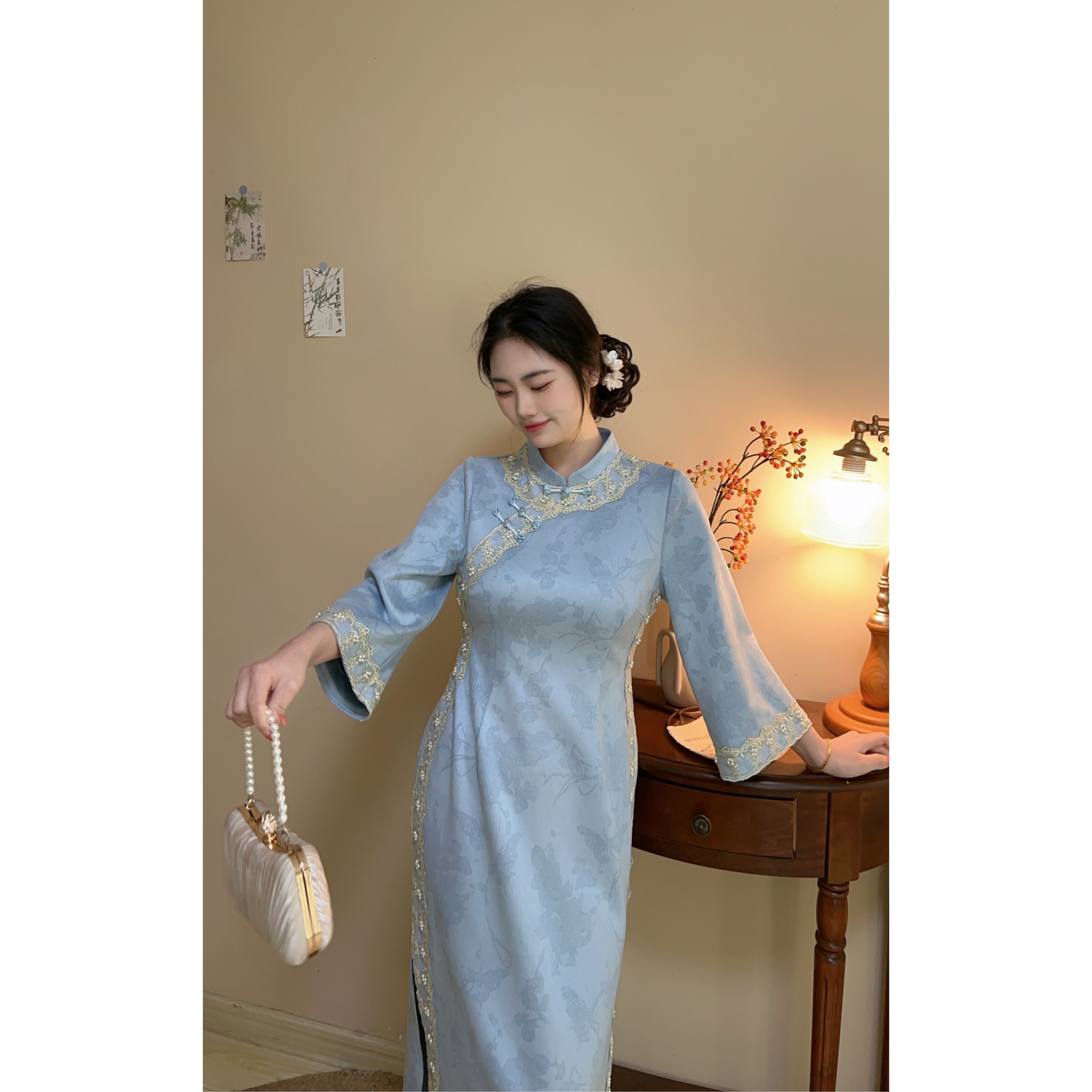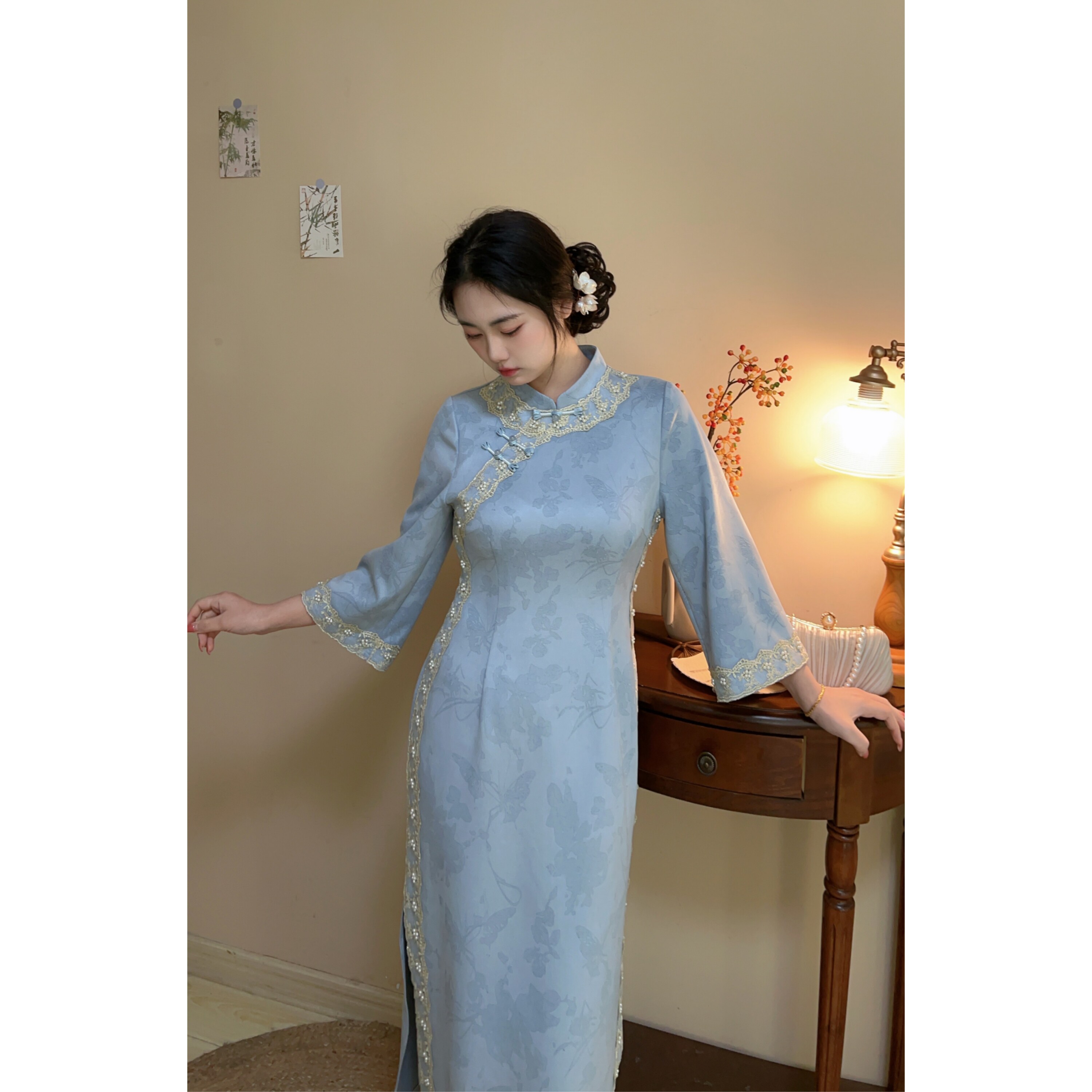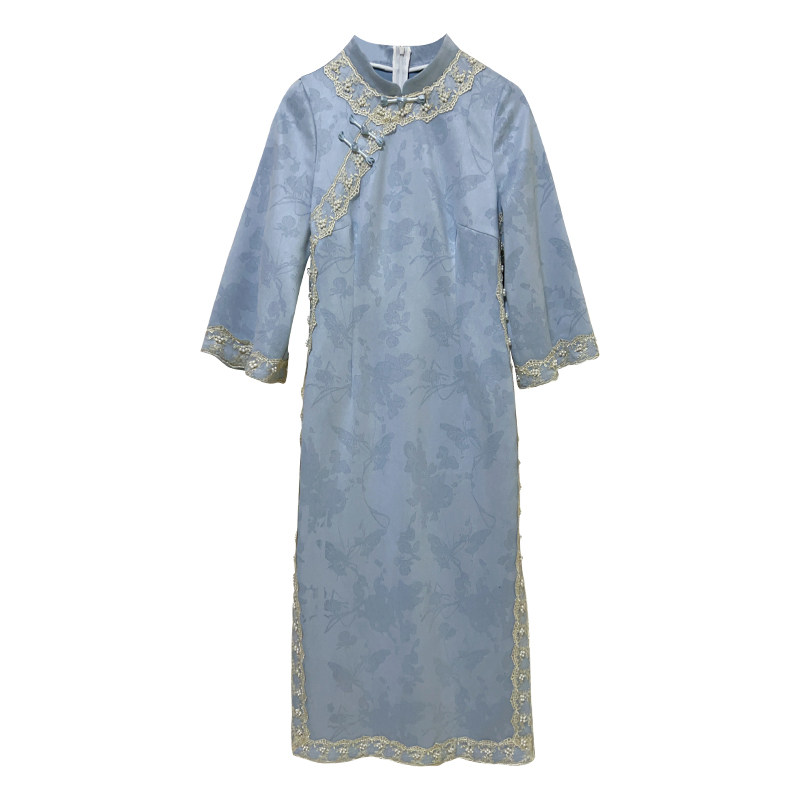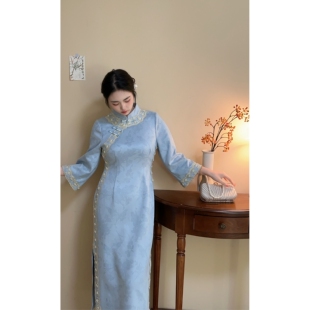 蓝色温柔麂皮绒高级感蕾丝珠链大码 早春新品 胖mm旗袍裙 自制款