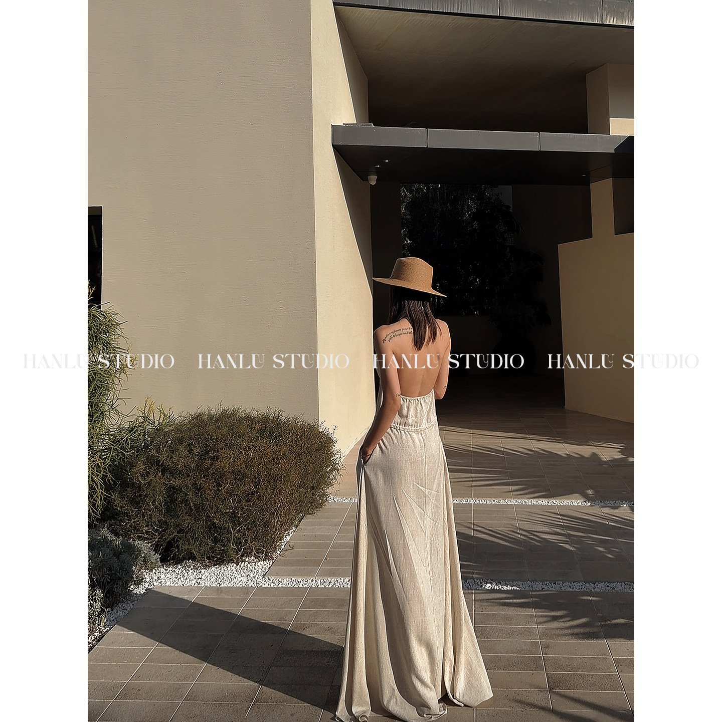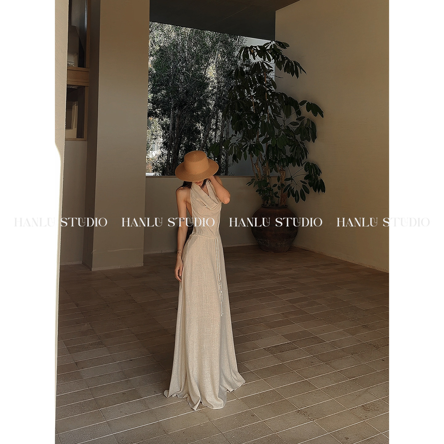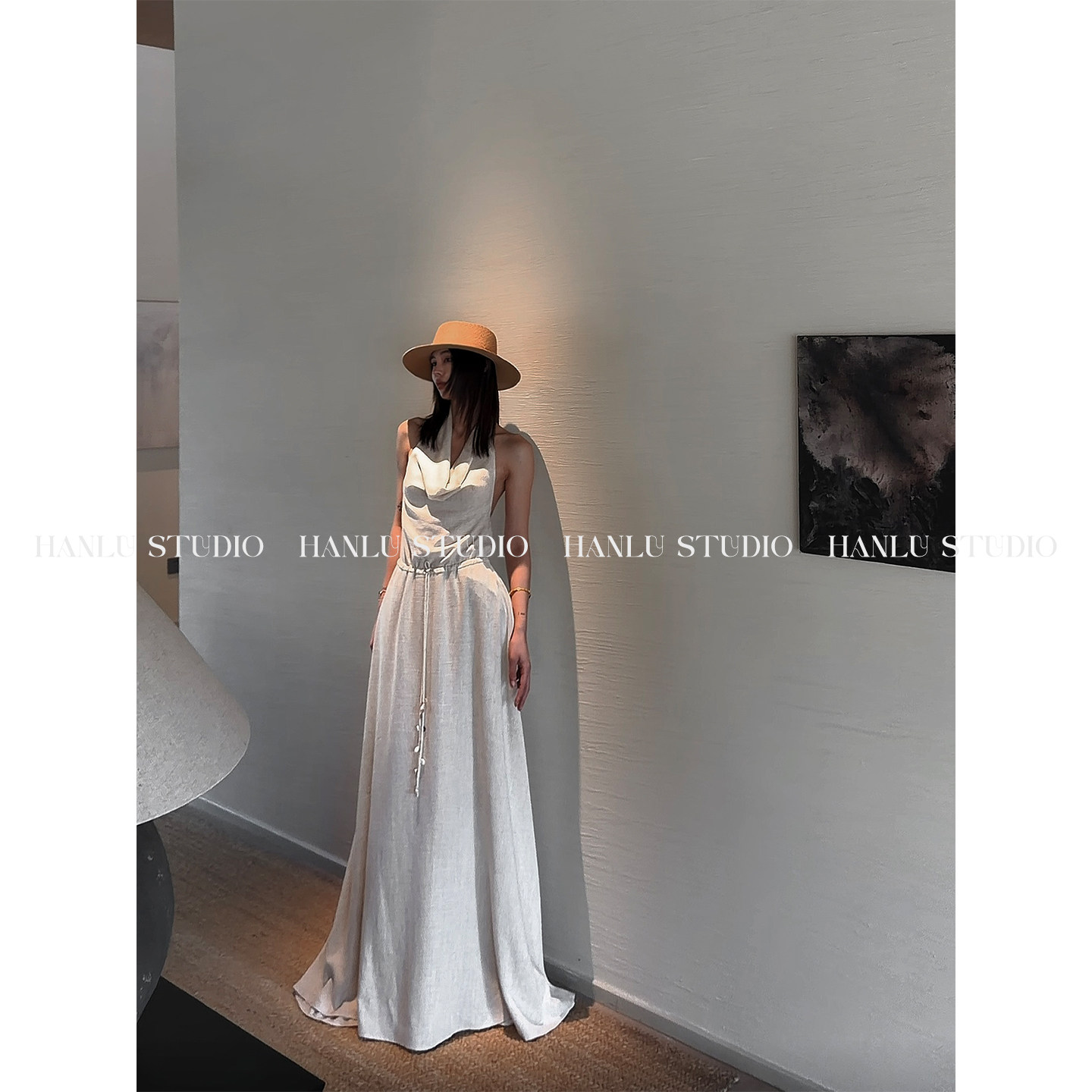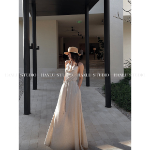 HANLU STUDIO品牌ss26原创棉麻挂脖露背定制原麻色纹理收腰连衣裙