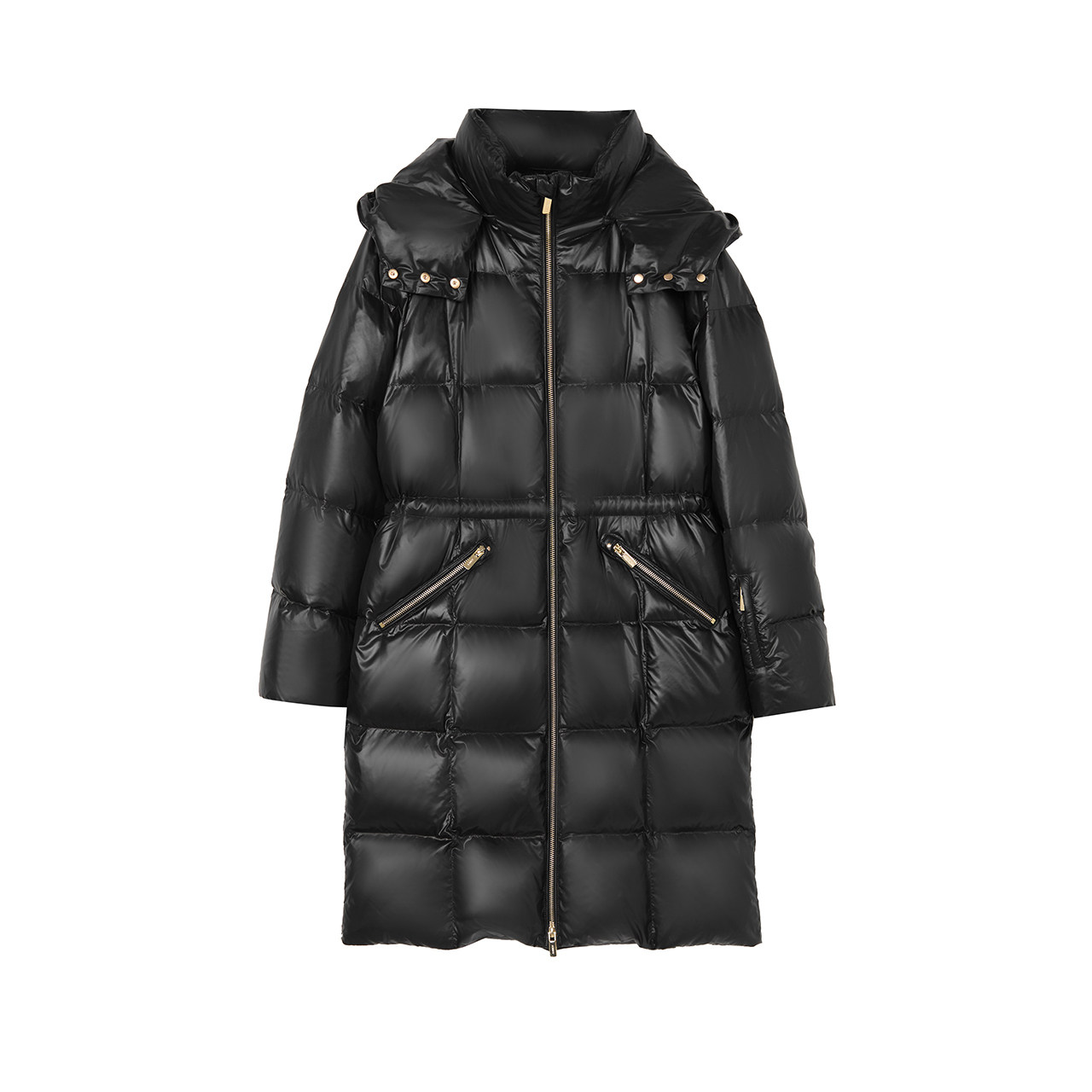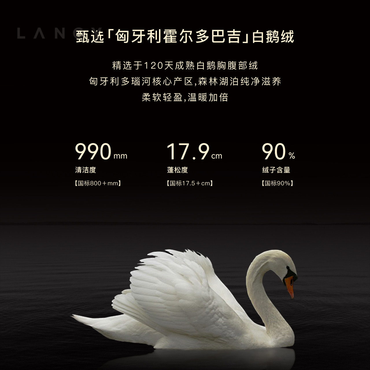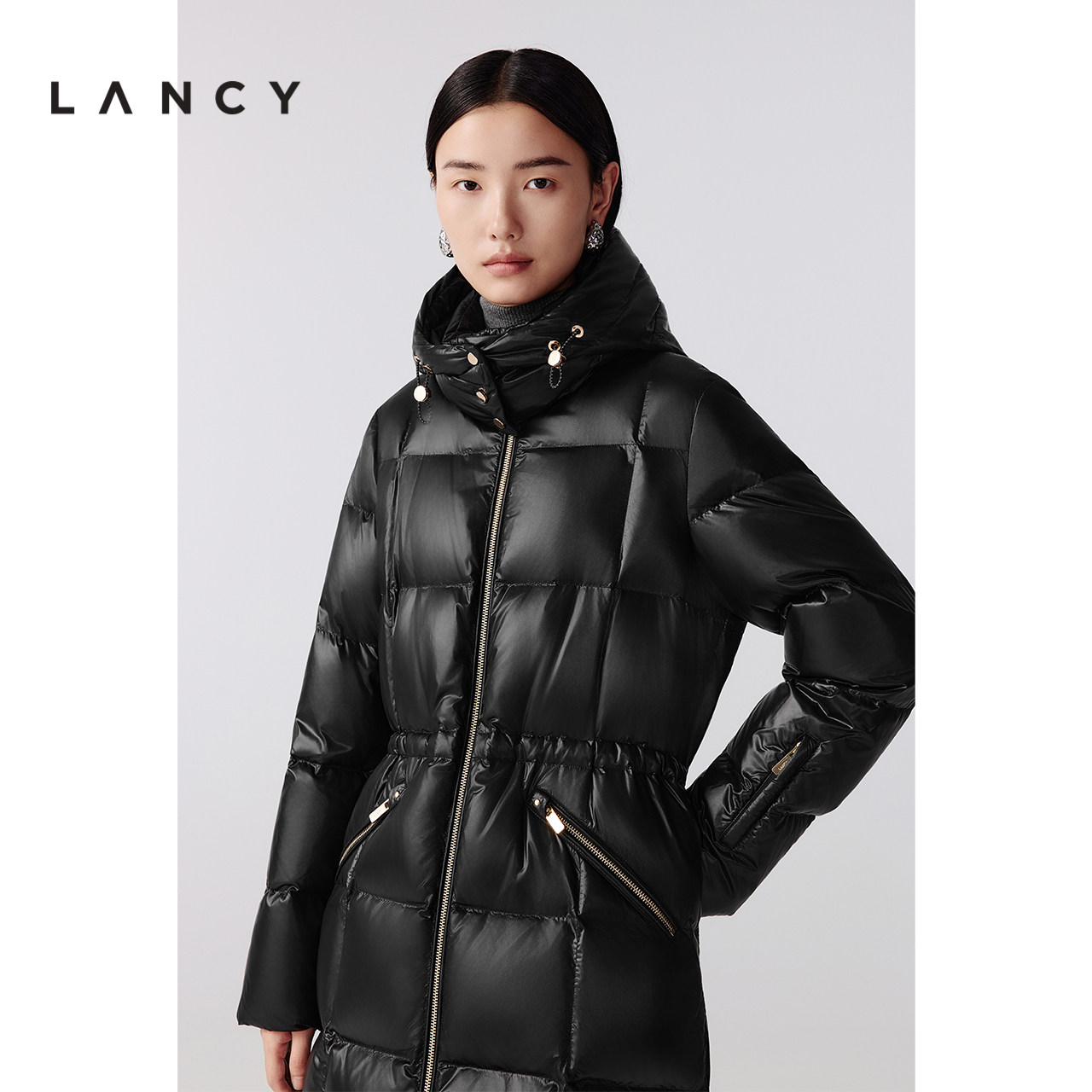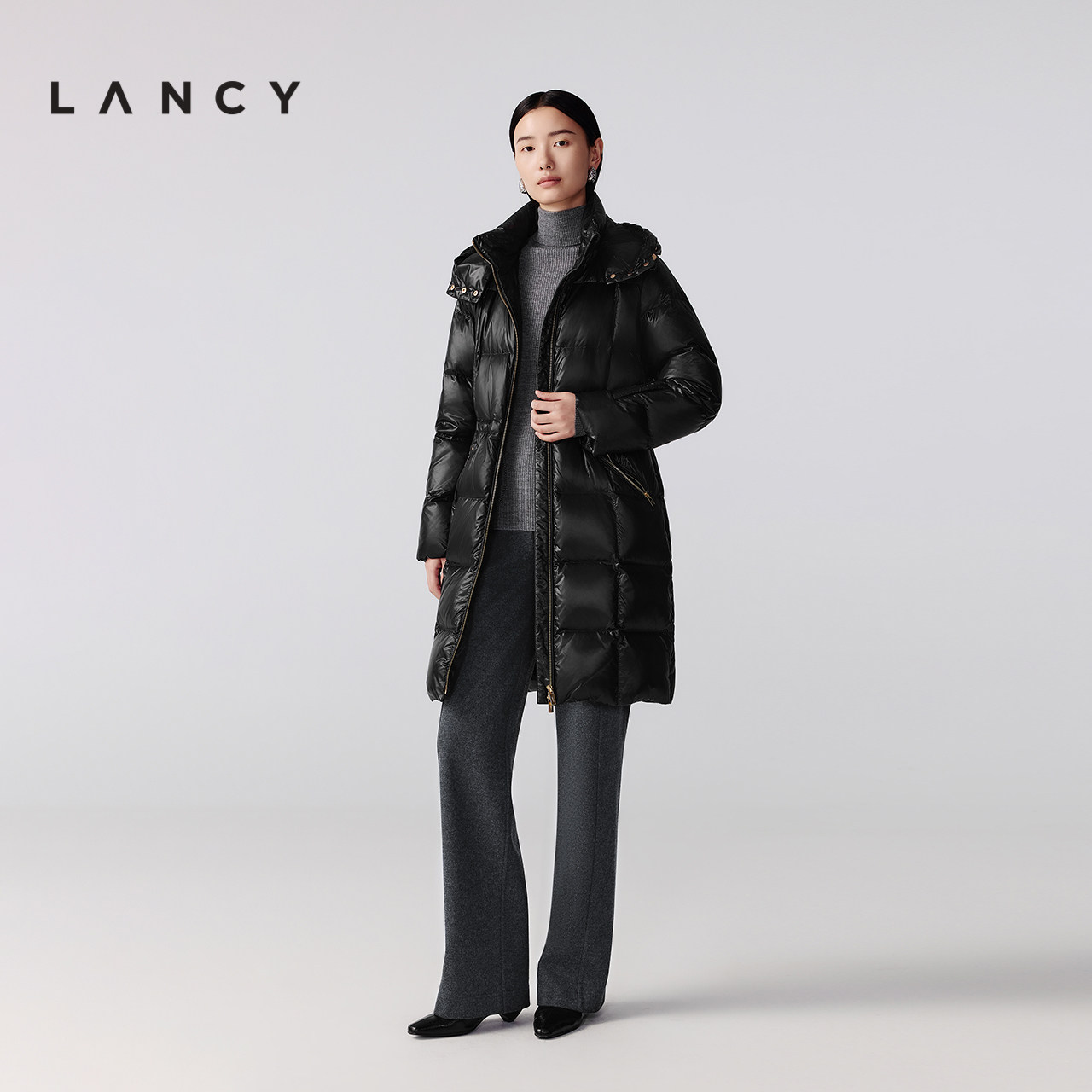 新款 朗姿2025冬季 LANCY 立领收腰亮面羽绒服长款 匈牙利白鹅绒
