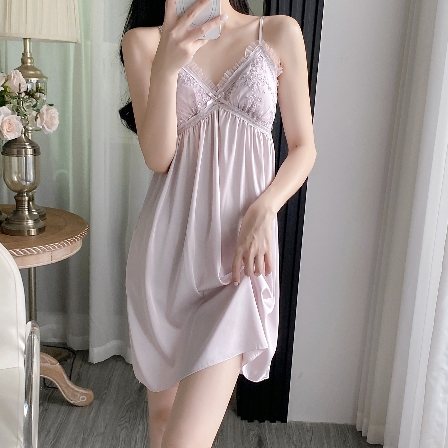 2025新款 性感冰丝睡袍纯欲风高级感蕾丝吊带睡衣 睡裙女春秋夏薄款