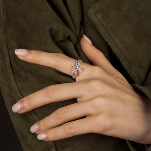 川野时尚 女戒指尾戒 创意树叶水钻开口可调节指环手饰网红气质个性