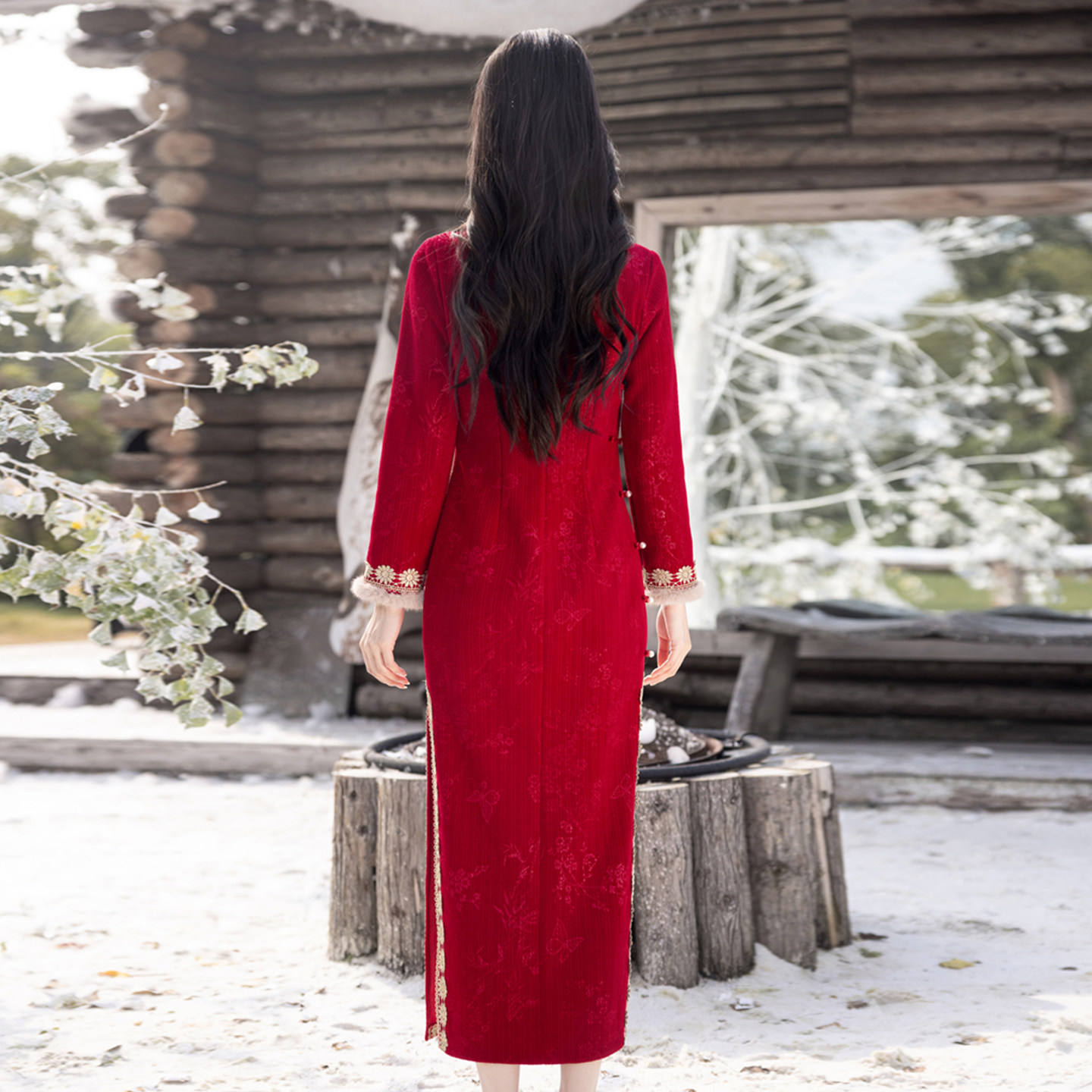 金梅报喜 高级感刺绣订婚过年礼服长袖 画报夫人新中式 红色旗袍冬装