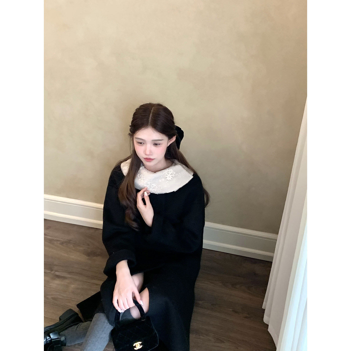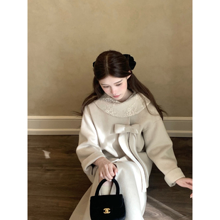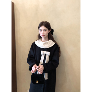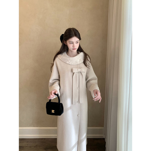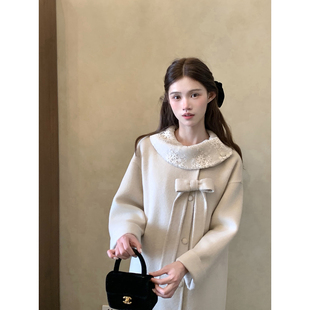 羊毛呢毛呢大衣女冬 刺绣领面蝴蝶结双面呢长款 桃可了 奶沫绵音