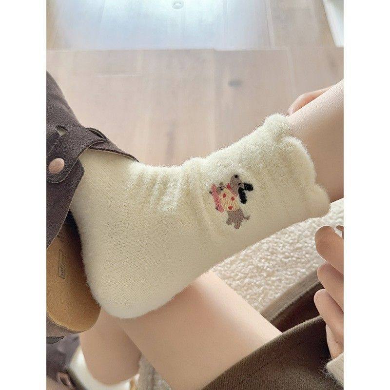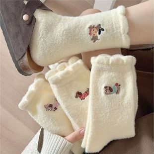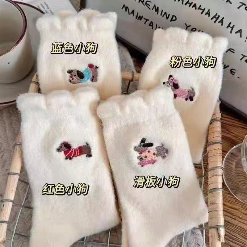 可爱俏皮袜子女中筒袜秋冬加绒加厚保暖袜日系卡通毛绒腊肠狗长袜
