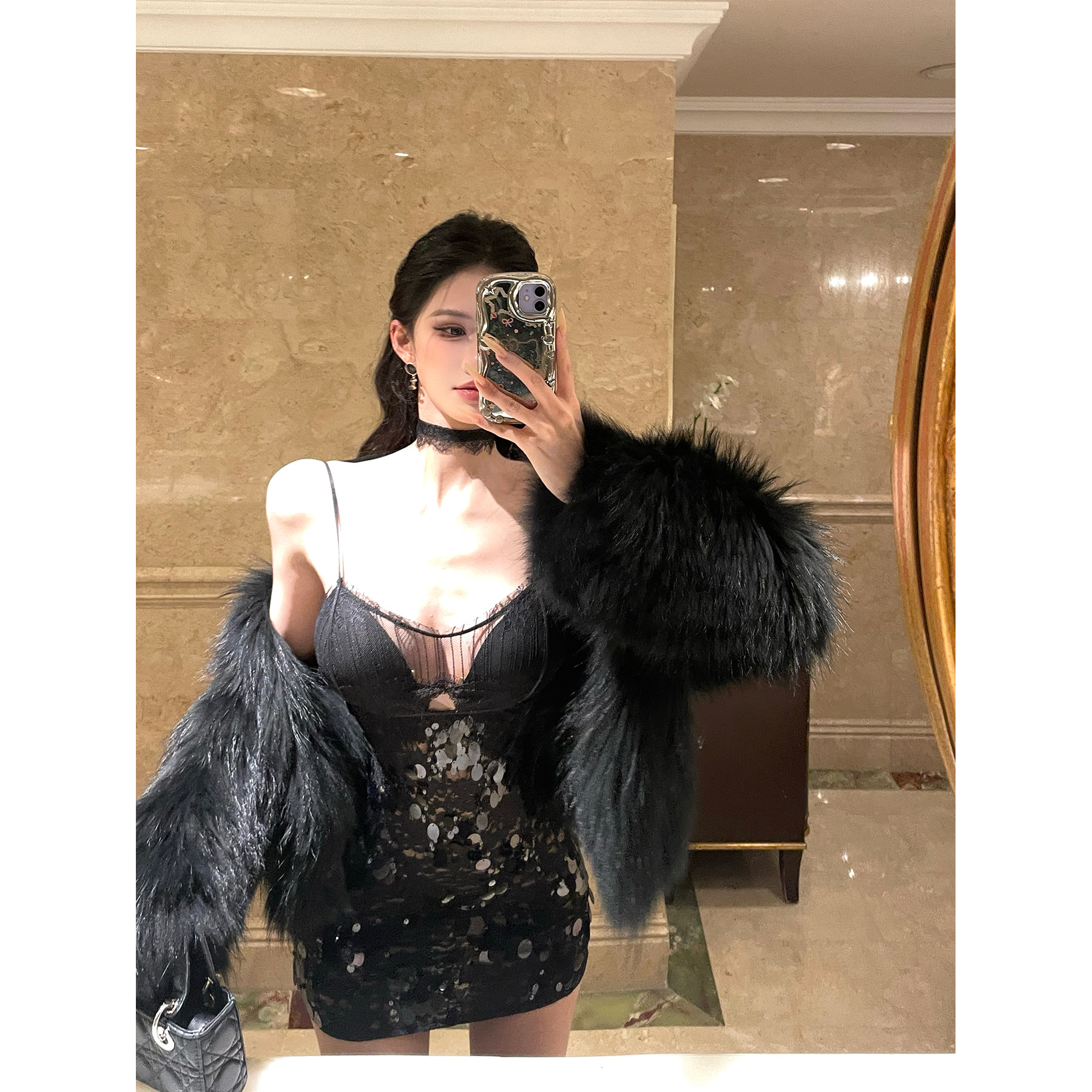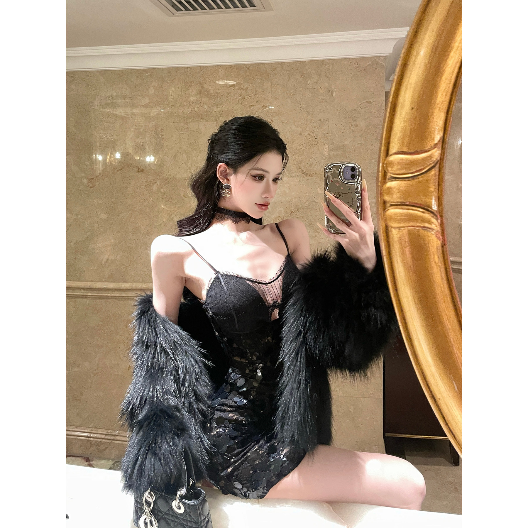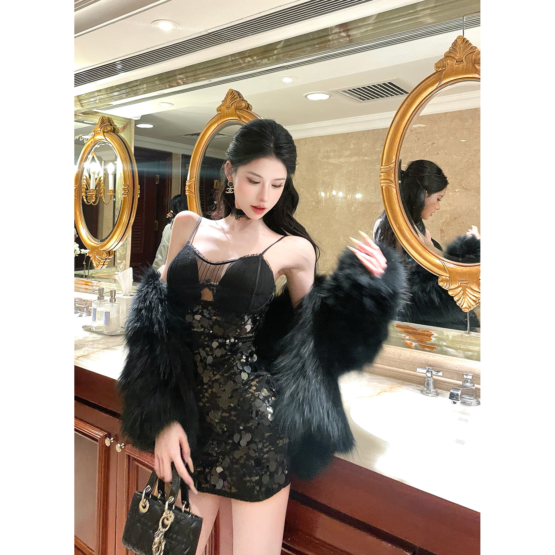 灰尘邓邓 蕾丝吊带连衣裙2025秋冬黑色性感包臀裙亮片开叉裙子