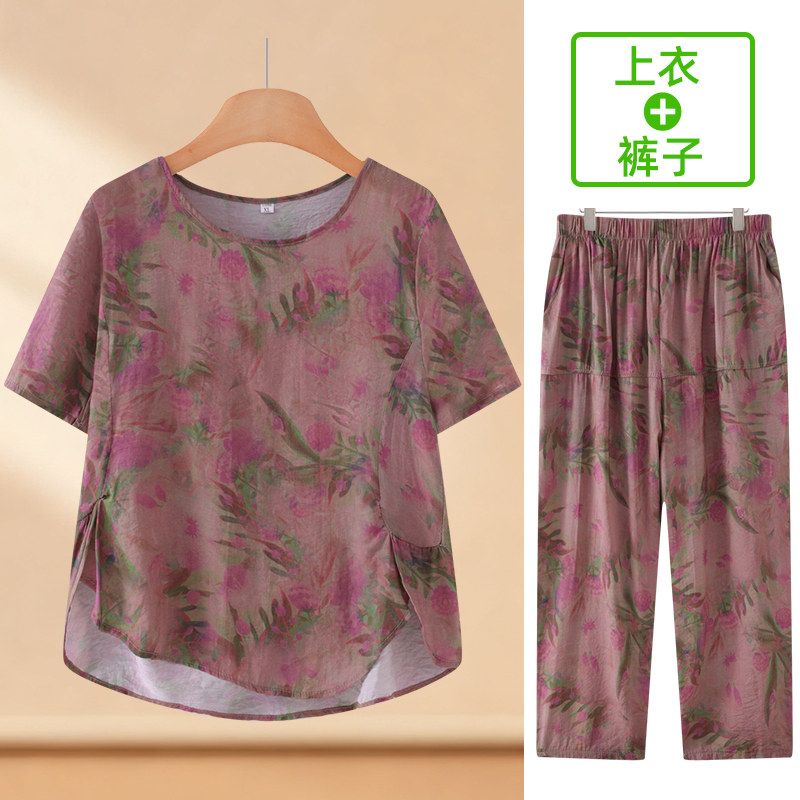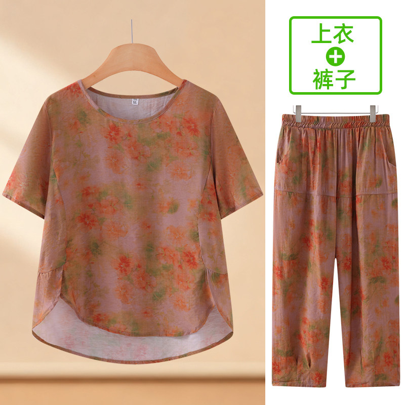 洋气印花短袖 宽松套装 T恤妈妈夏天两件套 中老年人女奶奶夏装 大码