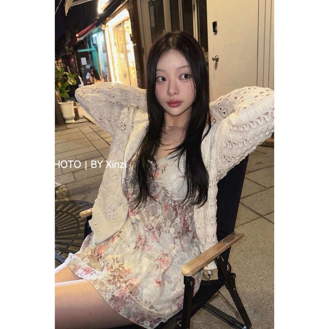 辛子韩国代购 显瘦小个子短裙 复古纯欲碎花吊带连衣裙女高腰修身