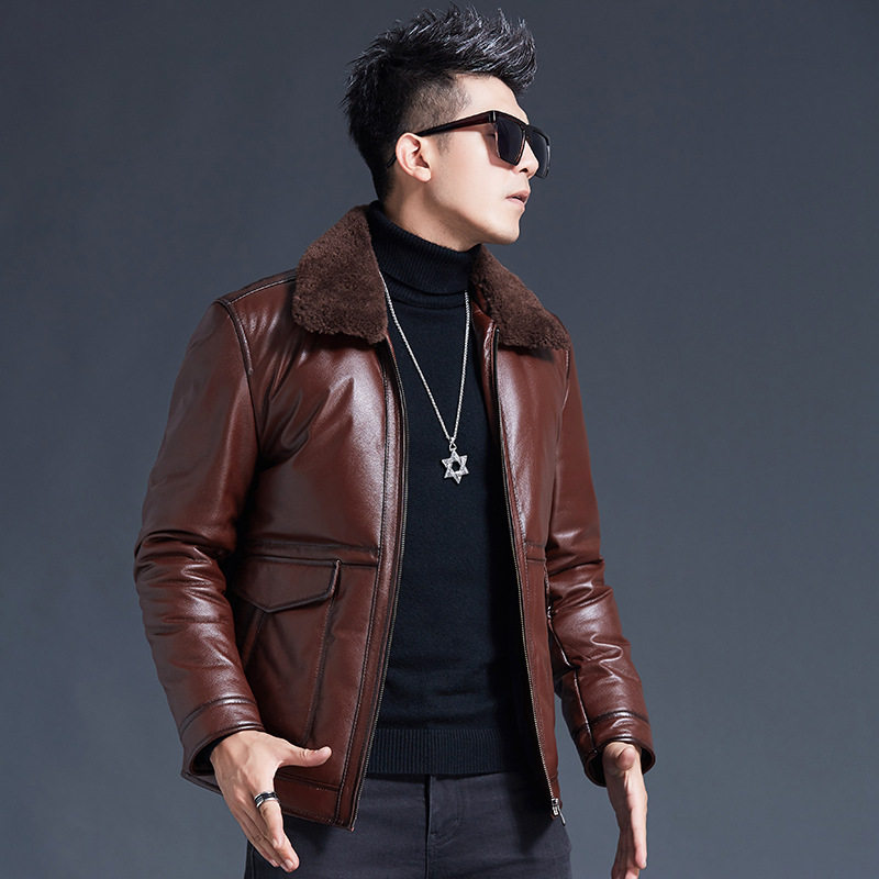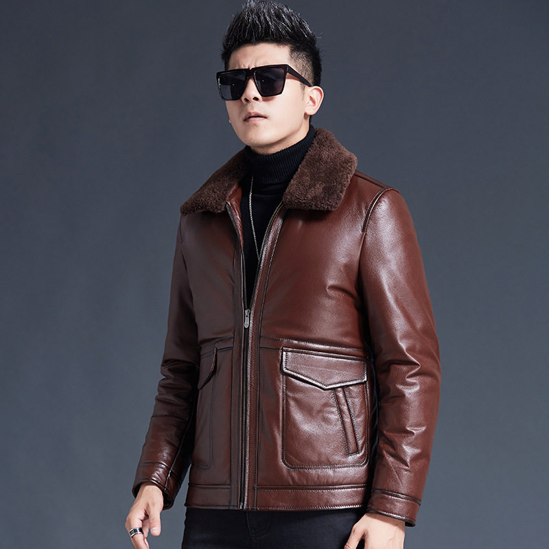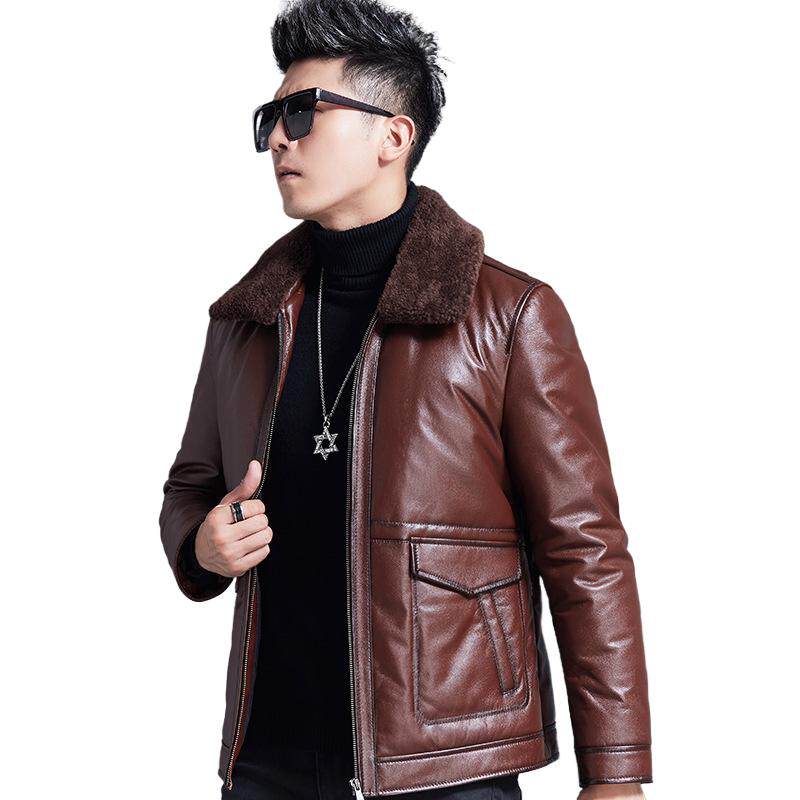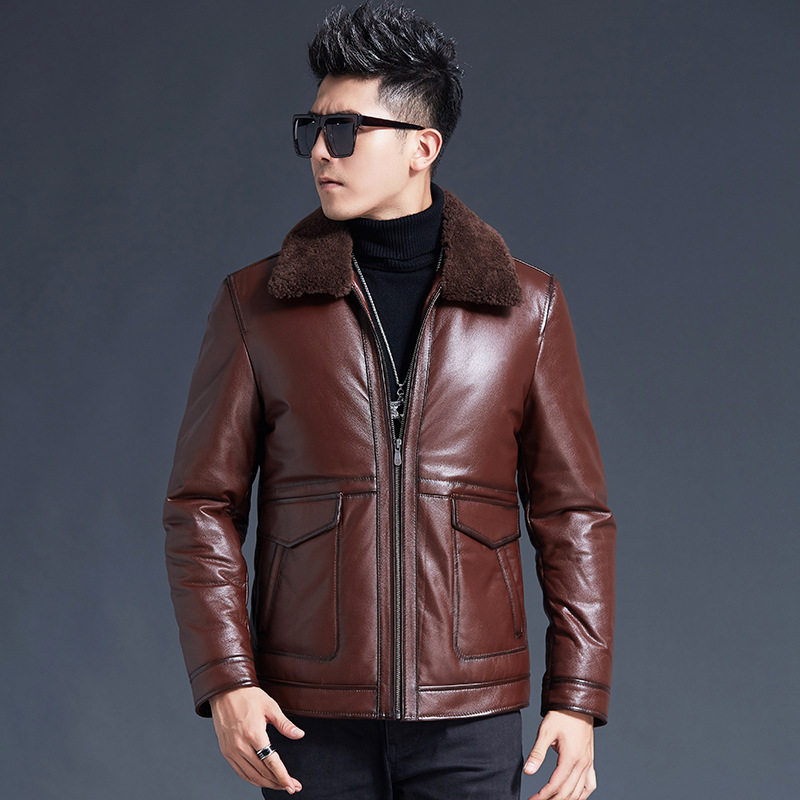 羽绒服男士 保暖纯牛皮 羊毛翻领可脱卸皮衣中年商务休闲冬季