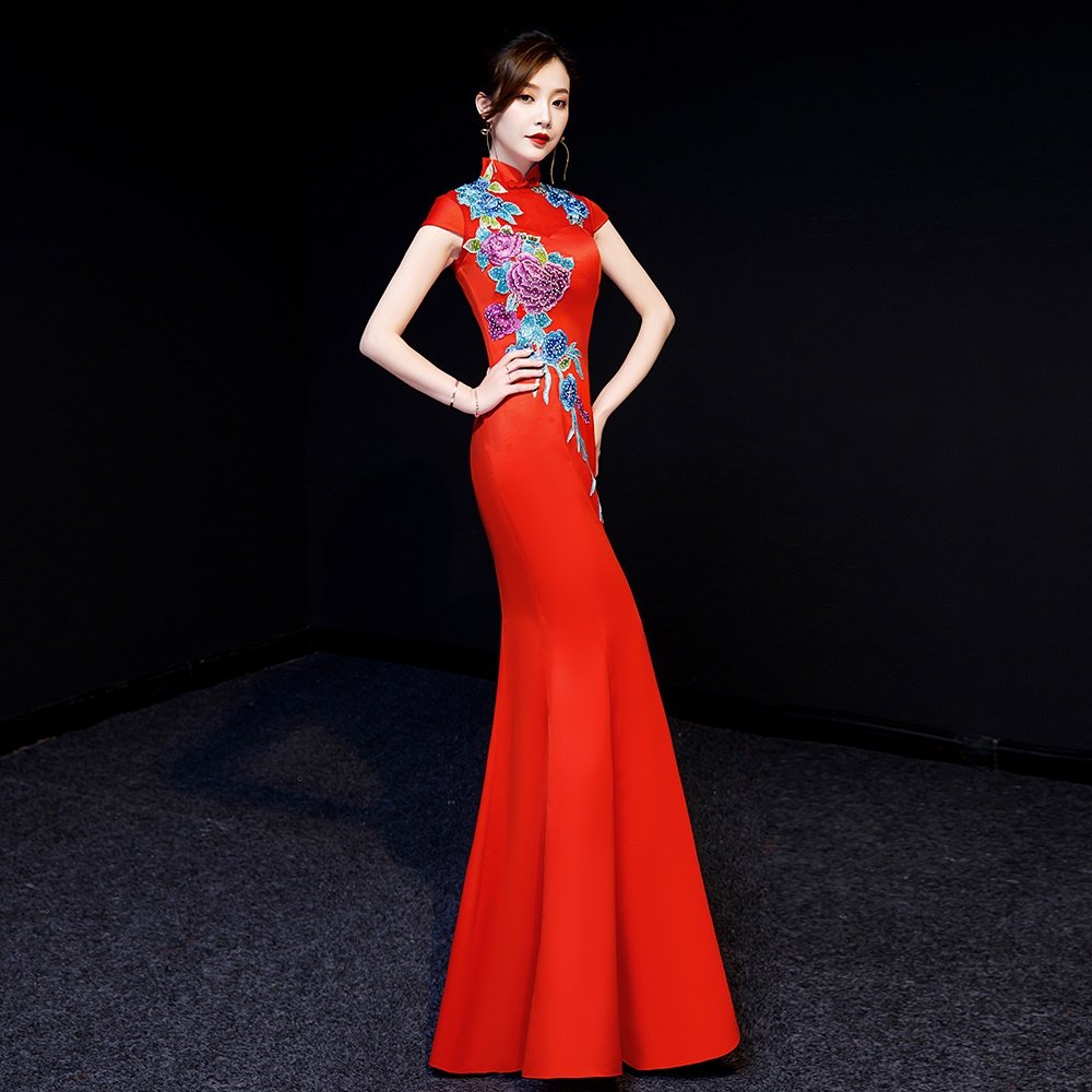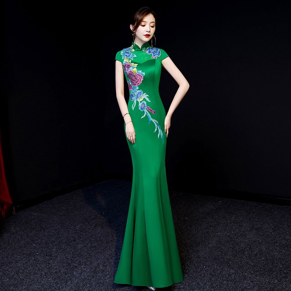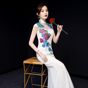 刺绣模特走秀演出服年会晚装 紫缘萱长款 礼服白色改良鱼尾旗袍中式