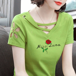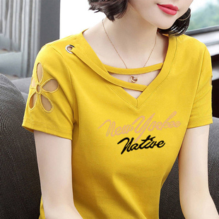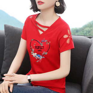 韩版 修身 大码 2024夏装 上衣 中年妈妈装 新款 时尚 V领t恤女士短袖 半袖