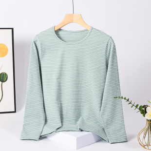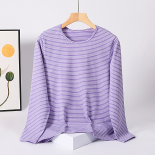 女莱卡棉秋衣中老年人条纹线衣妈妈薄款 圆领中领 打底内衣弹力修身