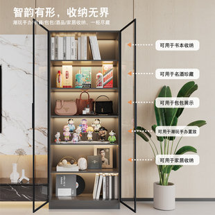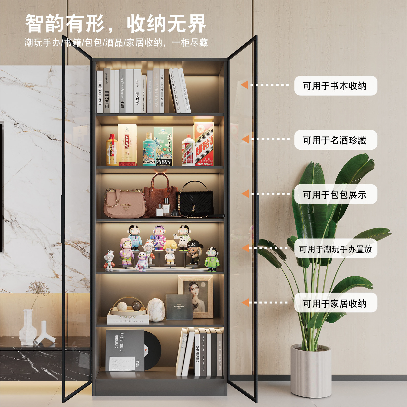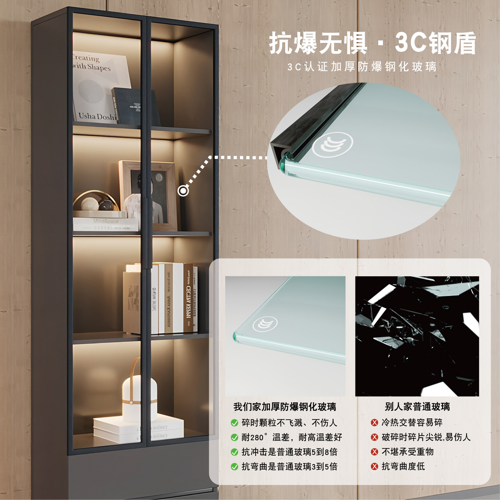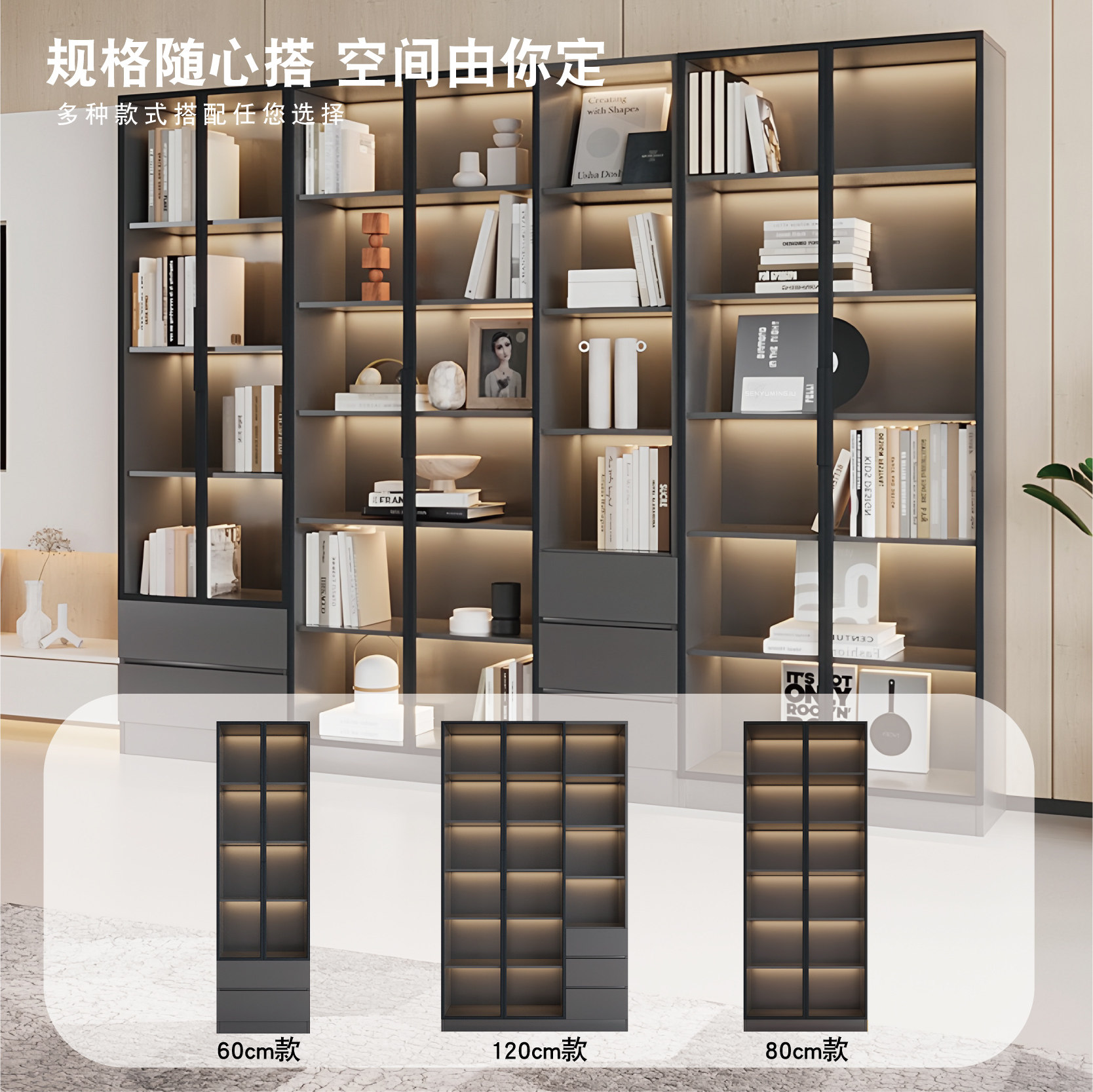 奶油风书柜落地组合钢制储物柜家用书架现代简约玻璃门防尘收纳柜