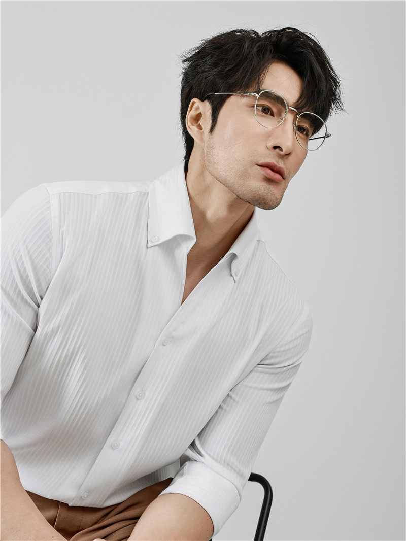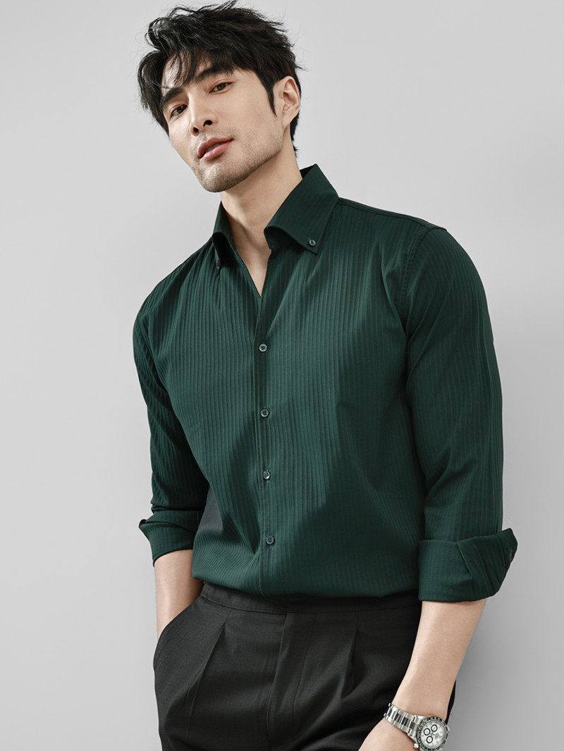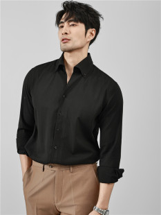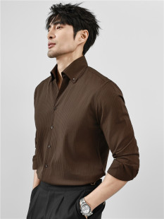 高级感大领商务休闲痞帅一片领咖啡色衬衣 男长袖 法式 V领条纹衬衫