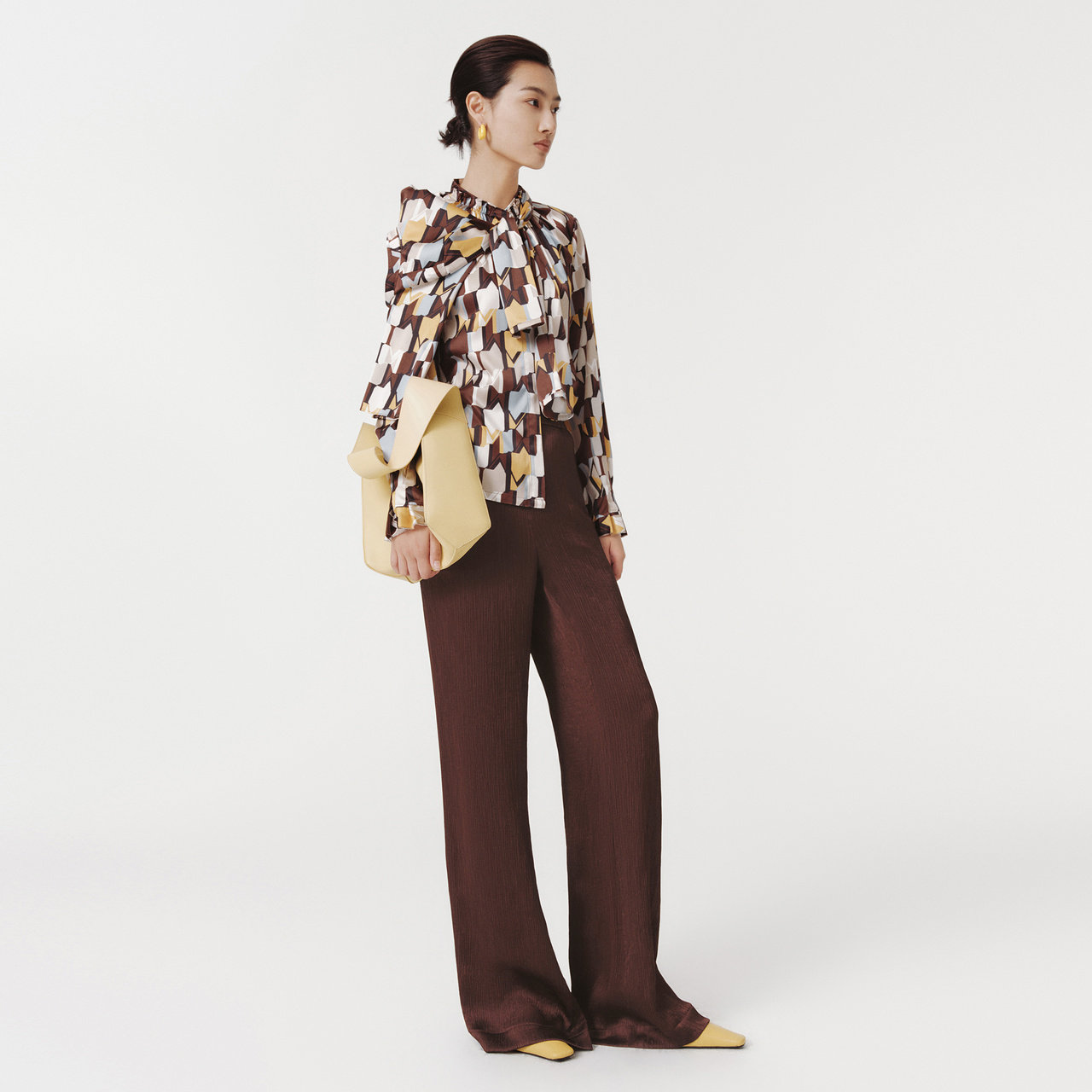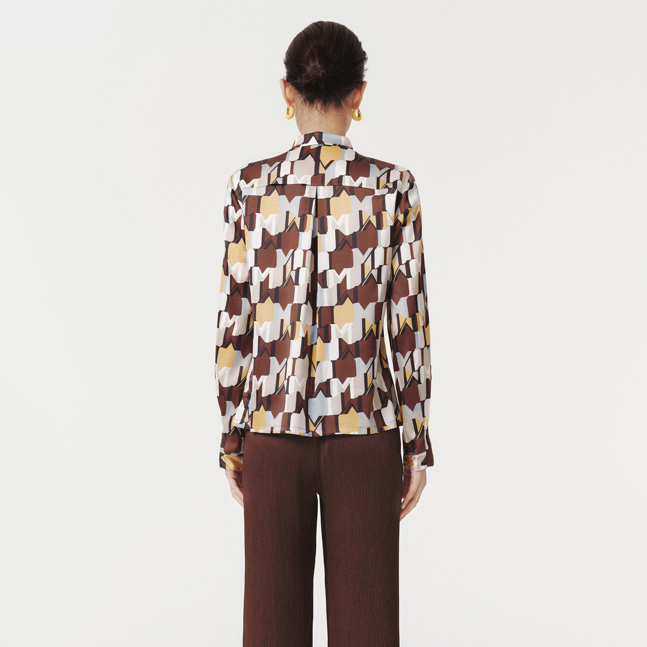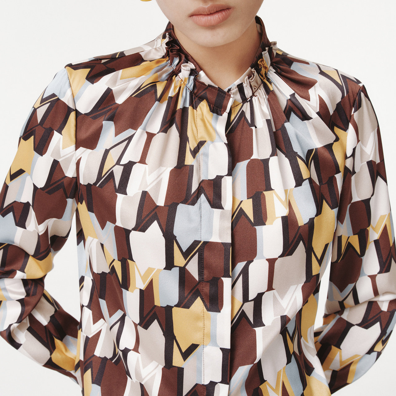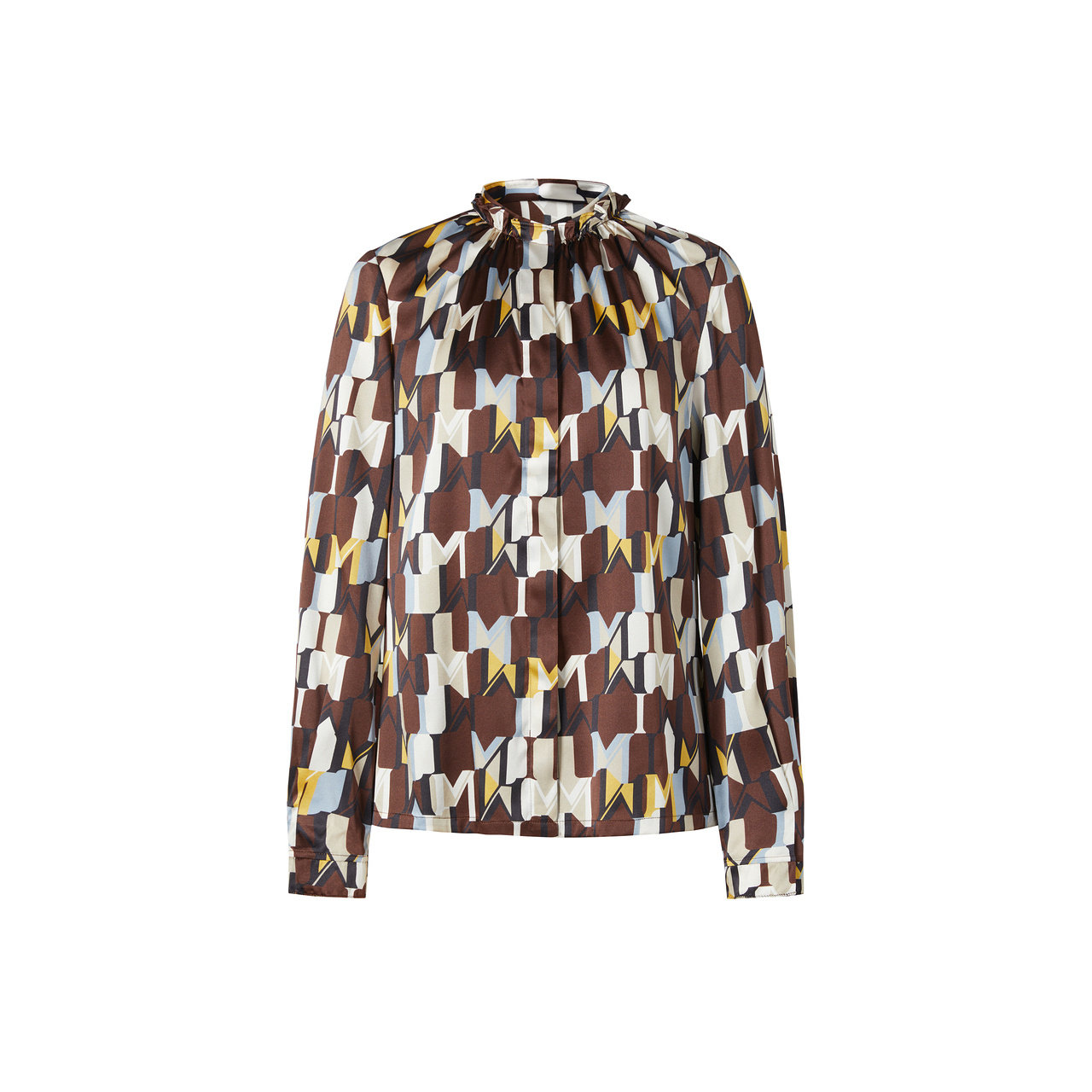 IMM尹默春19MM真丝弹力素绉缎Mlogo几何花型荷叶边衬衫 上衣女